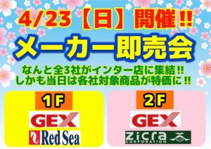こんにちは。インター店用品コーナーです。来る4月23日(日)はメーカー即売会開催!インター店に有名メーカー3社が集結! 1Fの淡水ブースに観賞魚メーカーで有名なジェックス株式会社の竹山氏が当日限定のアドバイザーとしてお越 … 続きを読む 春のメーカー即売会のお知らせ