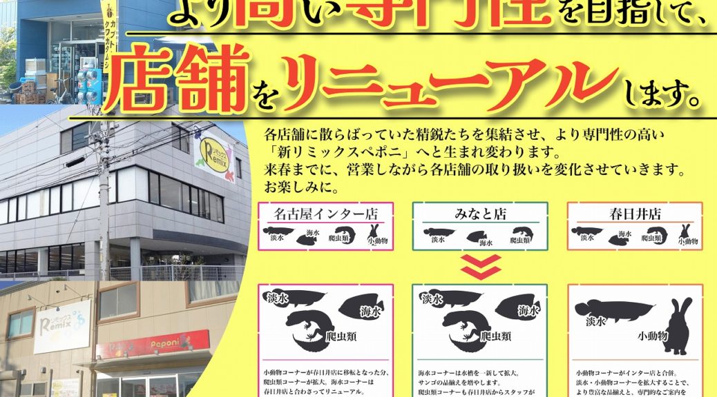 【重要なお知らせ】 リミックス・ペポニは店舗をリニューアルします!! リニューアルに伴い、春日井海水コーナーはインター店とみなと店に移転することとなりました。 11月末日までに完全移転を予定しておりますので、 10月31 … 続きを読む 【春日井海水】リニューアルに伴うお知らせ