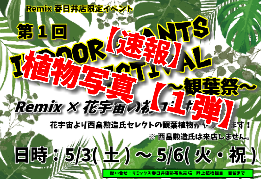 ど~も観葉植物担当の吉留です。 今回は写真の撮れたものから上げていきます。 今撮れてる写真は以上になります。 随時アップしていきますのでお待ち下さい。 アロイドとかはまだ撮れていませんので明日、明後日にはアップします。