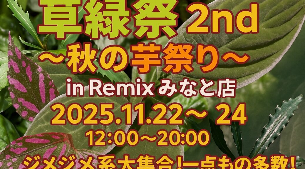 ※抽選について 22日の土曜日だけ 一応、抽選株は別で用意してます。 12時30分抽選(店内熱帯魚コーナーで) 13時00分販売開始 を予定してます。 開店からの30分は下見時間ですのでよろしくお願いいたします。 ※抽選 … 続きを読む 草緑祭