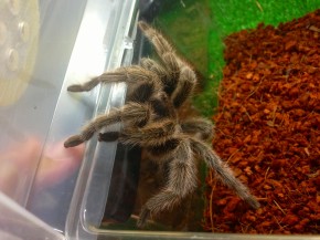 飼い易いタランチュラです。必ずしも活きた昆虫は必要なく、冷凍コオロギを転がして置くだけ