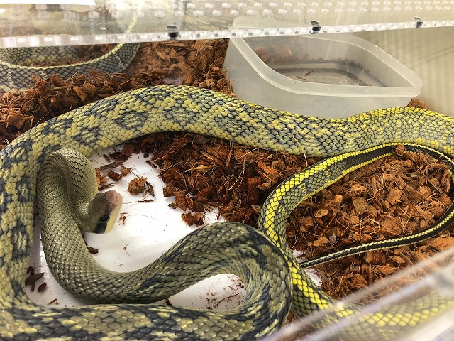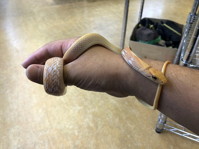 ボアやパイソンのアルビノ個体によく見られる濃いめの黄色が基調でオレンジの部分と赤い目が印象的です。