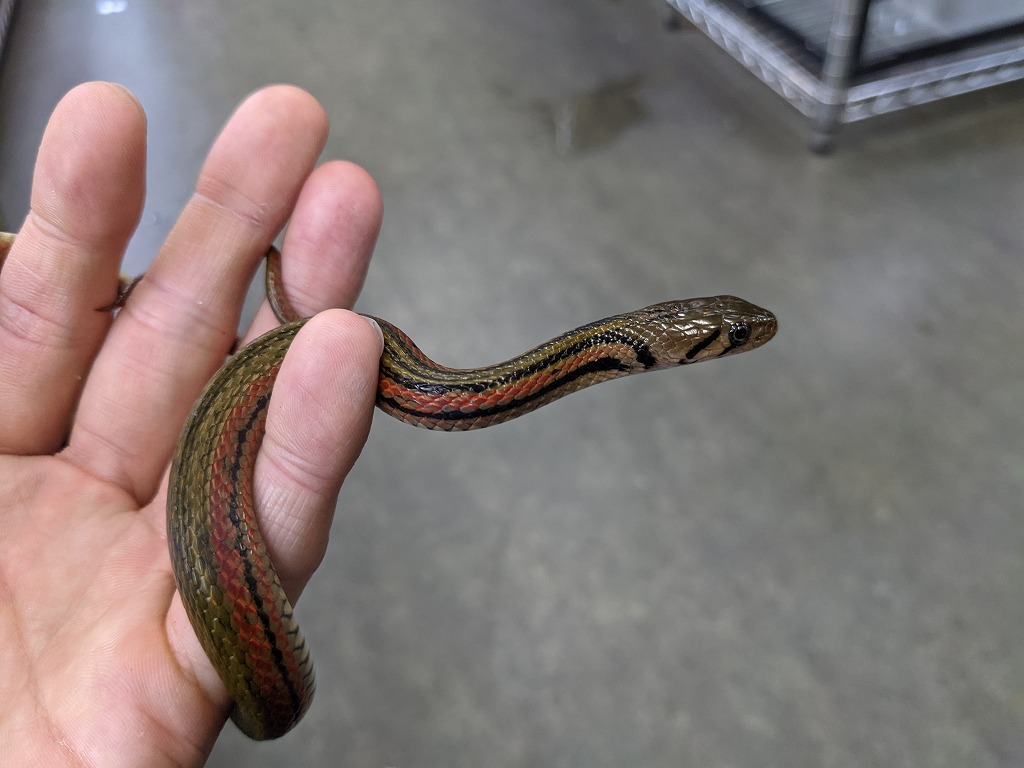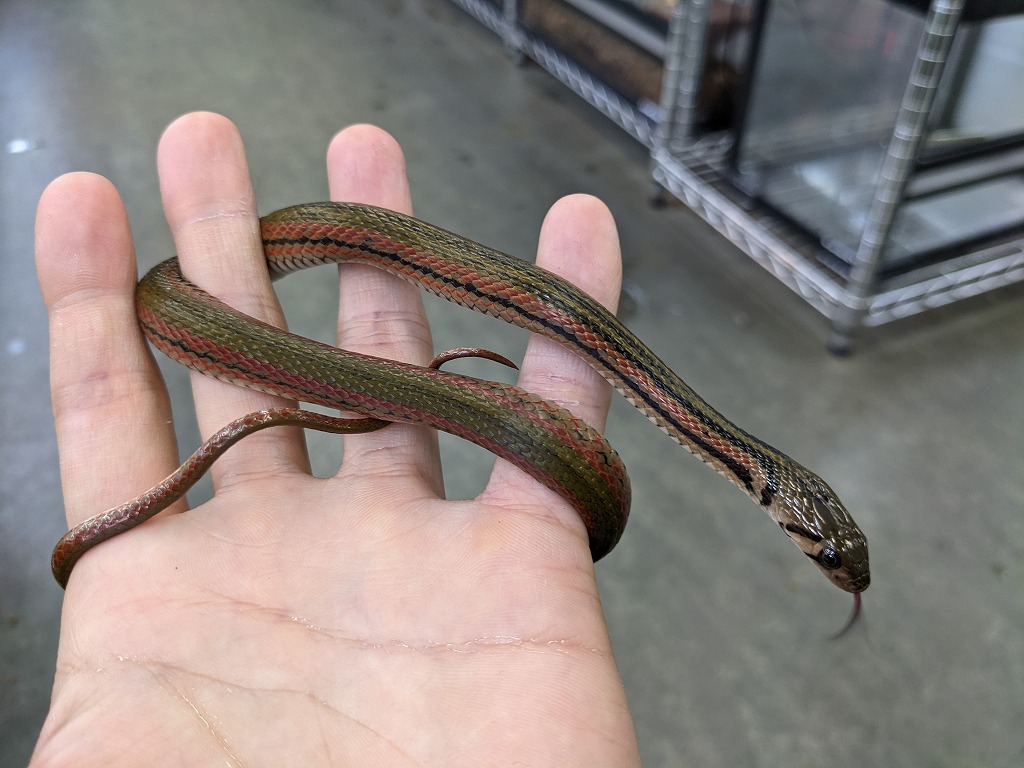 オリーブグリーン・黒・赤の3色のストライプがくっきり入った美しい個体!