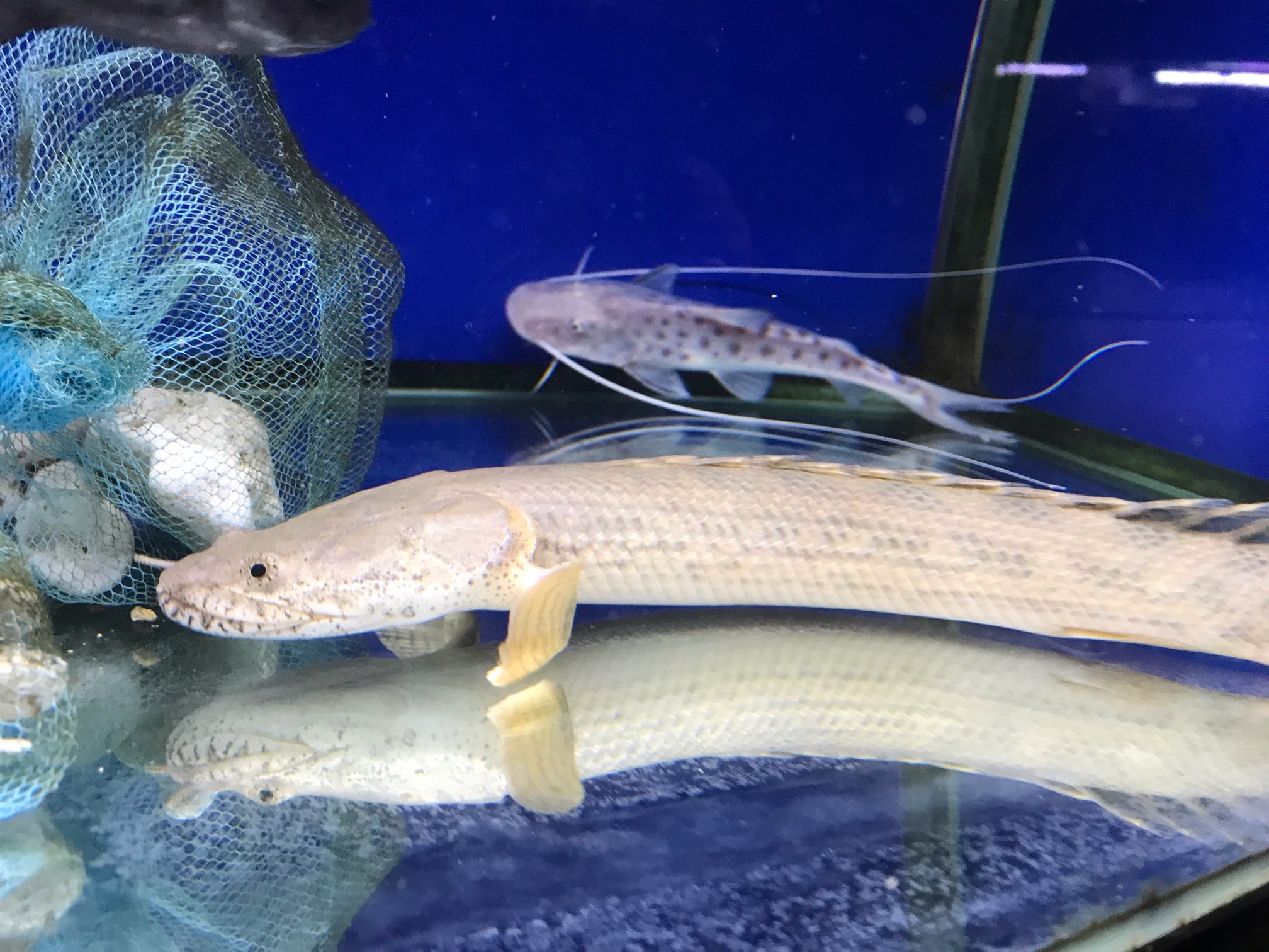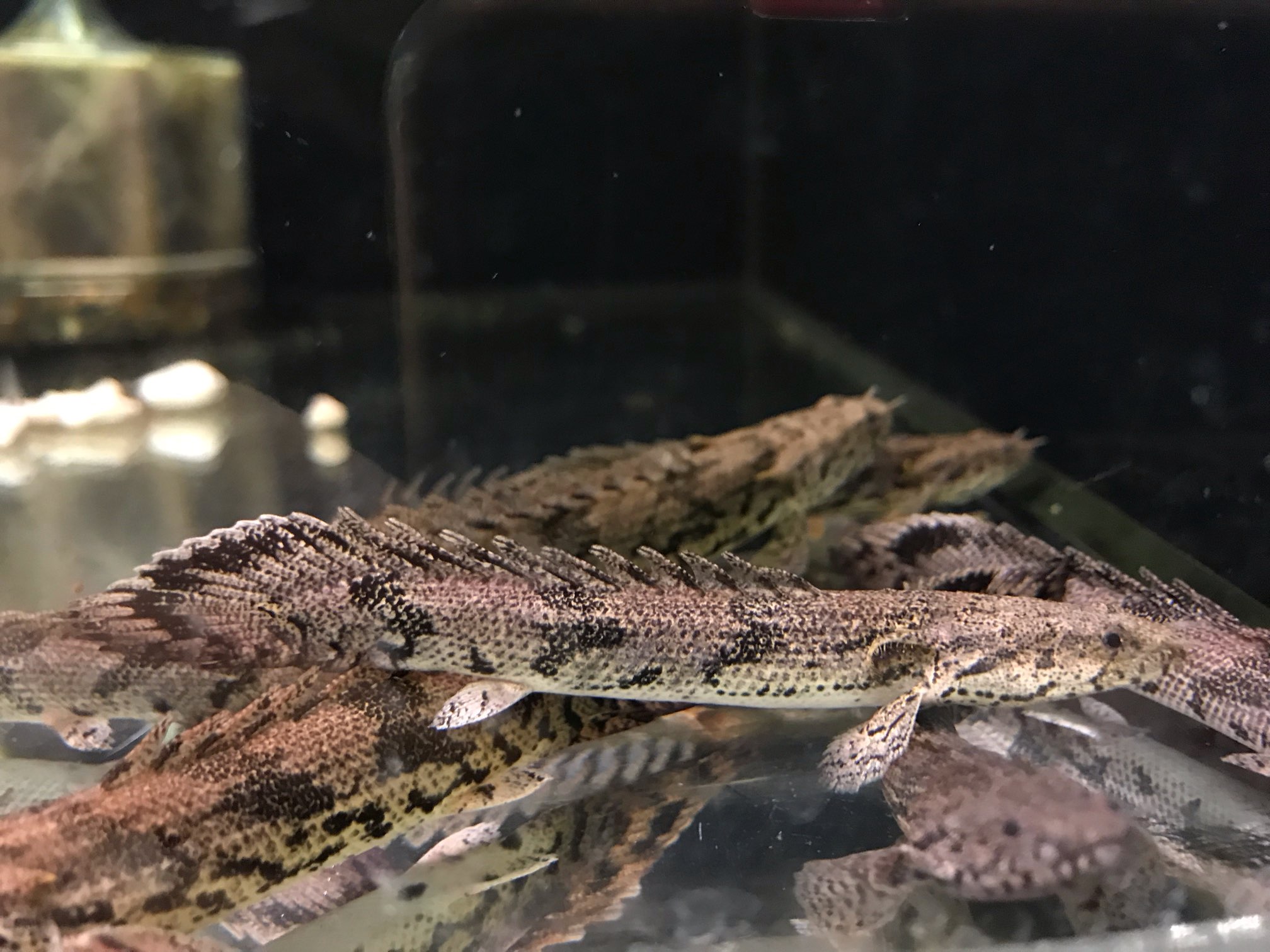 ポリプテルス最大種とされており、背鰭の鰭条数がポリプテルスの中で最多であり、より恐竜らしさが感じられる種だと思います。現在はベアタンク環境での飼育のため体色は白いですが、床砂のカラーで自分好みに出来るといった点も楽しみの一つですね。
