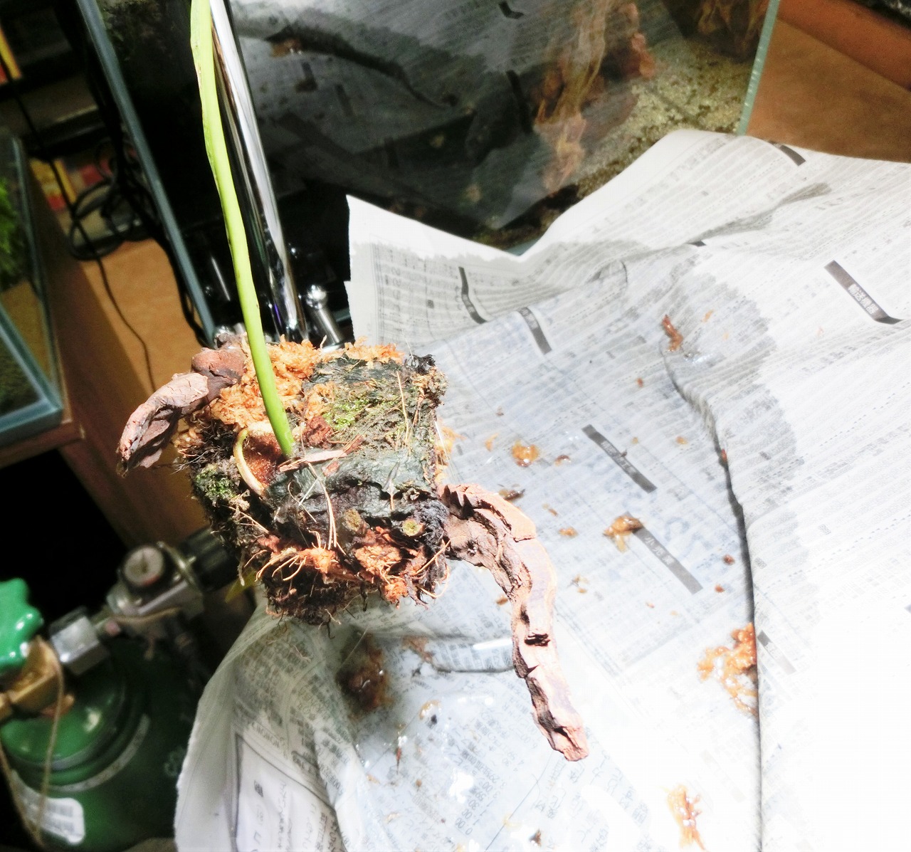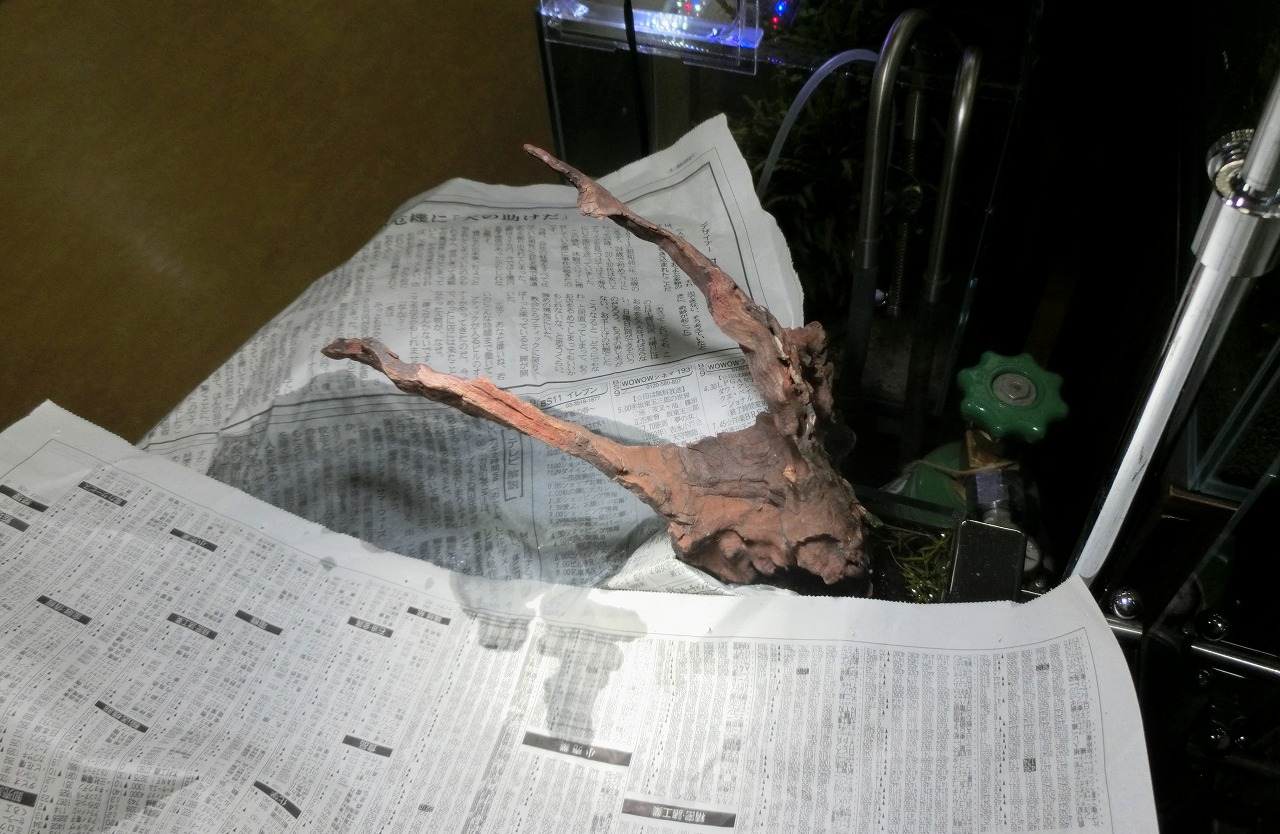ミズゴケのカスが水面に落ちないように新聞を敷いておきます。