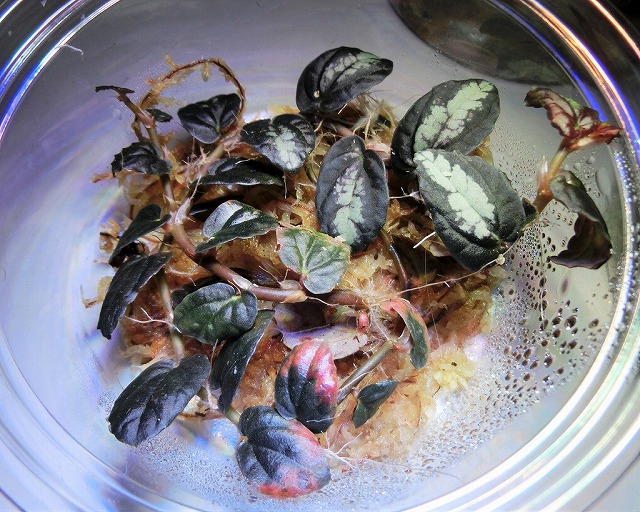 池の中からごく少量を採取し、野外の睡蓮鉢で1年間栽培したところ、夏は一面を 真っ赤覆い、草丈も低いまま、簡単に育ちましたので、勝手に品種名をつけて流通させてみることにしました。