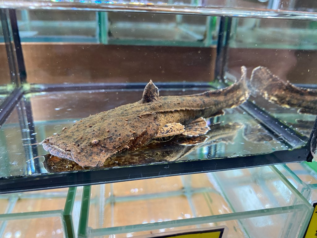 平たい頭と体、大きな口が特徴的な最大20センチ程のナマズです。水底に沈んだ落ち葉に擬態して水底に潜み、近づいてきた獲物をひと飲みにします。自分の半分くらいの大きさもある魚を食べてしまうことがあるので、混泳には注意!