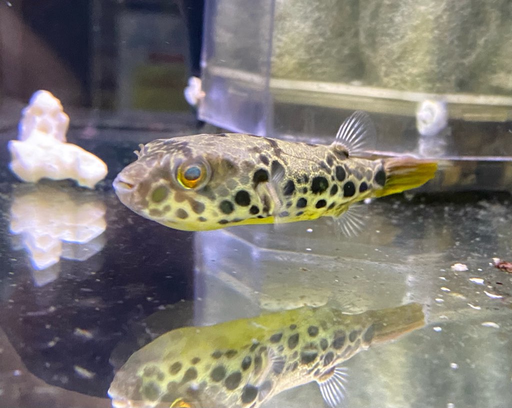 黄色いボディーに大き目の黒いスポットが入る可愛らしい小型の淡水フグです。