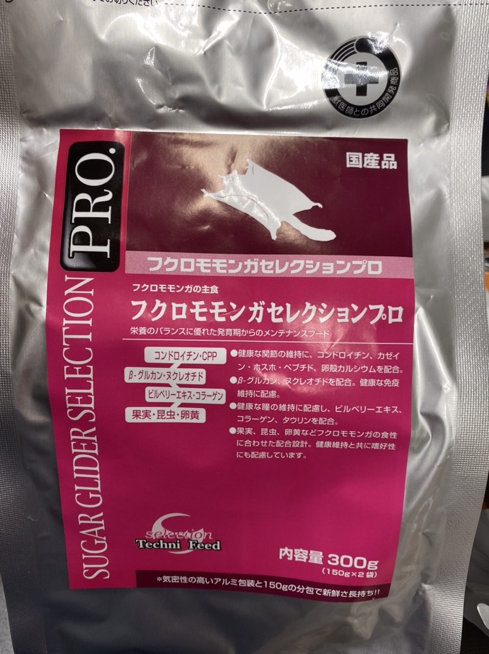 さらに好き嫌いのフリ幅が大きいフクロモモンガの食性に合わせて「果実」・「昆虫」・「卵黄」など配合して嗜好性に大きく配慮されているので一度試してみる価値アリ!!!