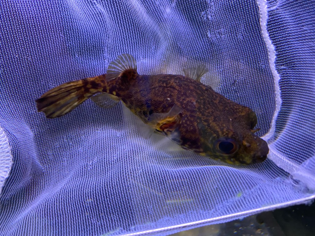 中型の淡水フグで、大きな目と背中が盛り上がったような体型、お腹の模様が可愛らしいのが特徴です。泳ぐときに胸ビレをものすごく高速で動かして一生懸命泳いでいる姿がとても愛くるしいです。