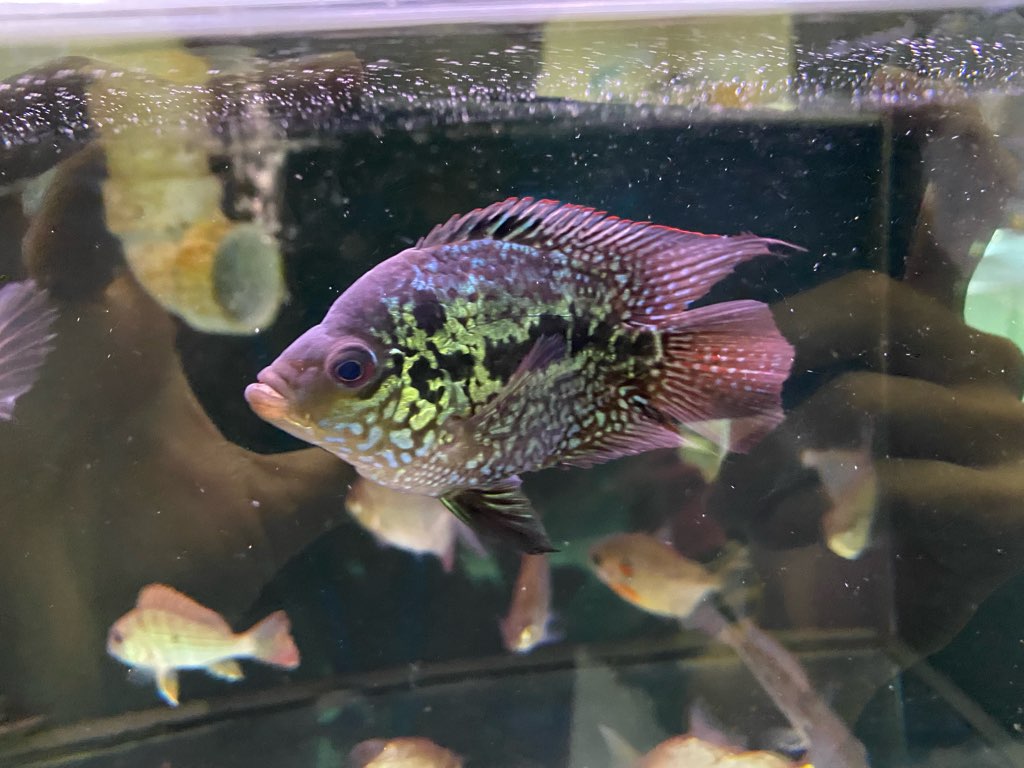 フラワーホーン柄のずんぐりとした体型が愛らしい中型シクリッドです。