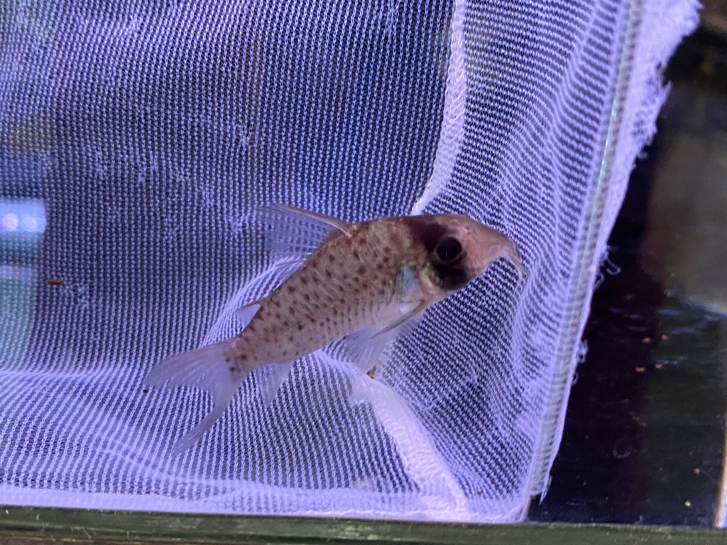 目に入る太い漆黒のバンドと白い体色に入る点々模様が綺麗なコリドラスです。