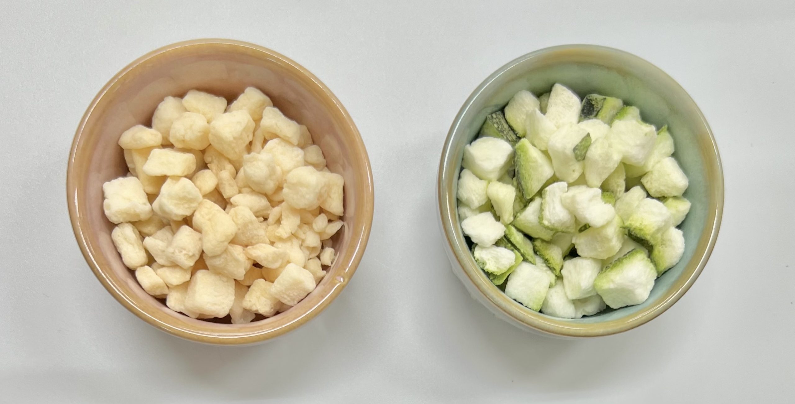 果物や野菜をフリーズドライしたおやつはたくさんありありますが、だいたい形をそのまま残しているのが多く、ハムスターなど体の小さな子にあげるときは小さくちぎって…なんてしなきゃいけなかったのですが、なんと!!!