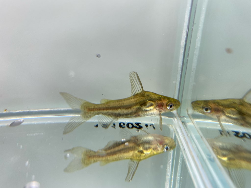 半透明 な 体 に 黒い 一本 の ライン が 入る小型のナマズです