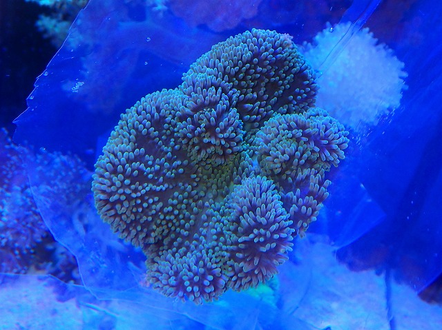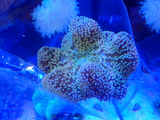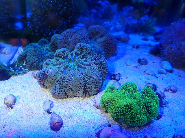・ハタゴイソギンチャク メタルグリーン これまた小ぶりでグッドなサイズ^^ ちなみに写真に写ってるマガキガイはチビマガキで1.5-2.5cm±です♪