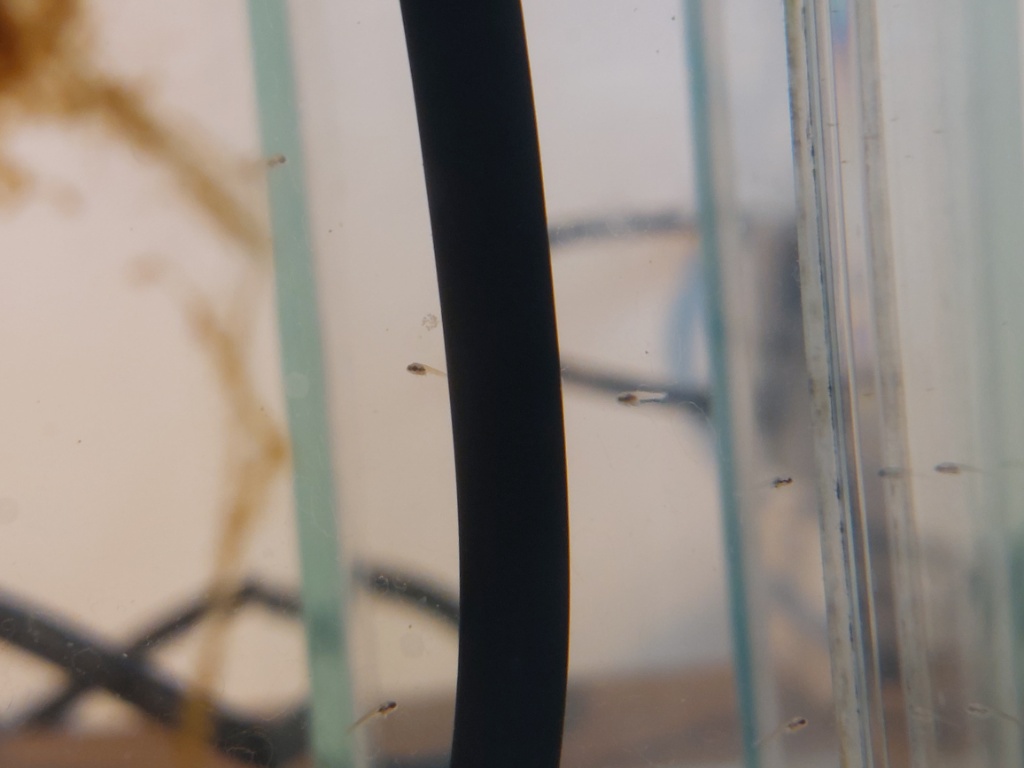 孵化五日目で泡巣から離れ自由遊泳を始めたので、雄親を取り出し稚魚だけにしました。その後、液体フードの添加を開始しました。ざっと100匹以上は生まれました。