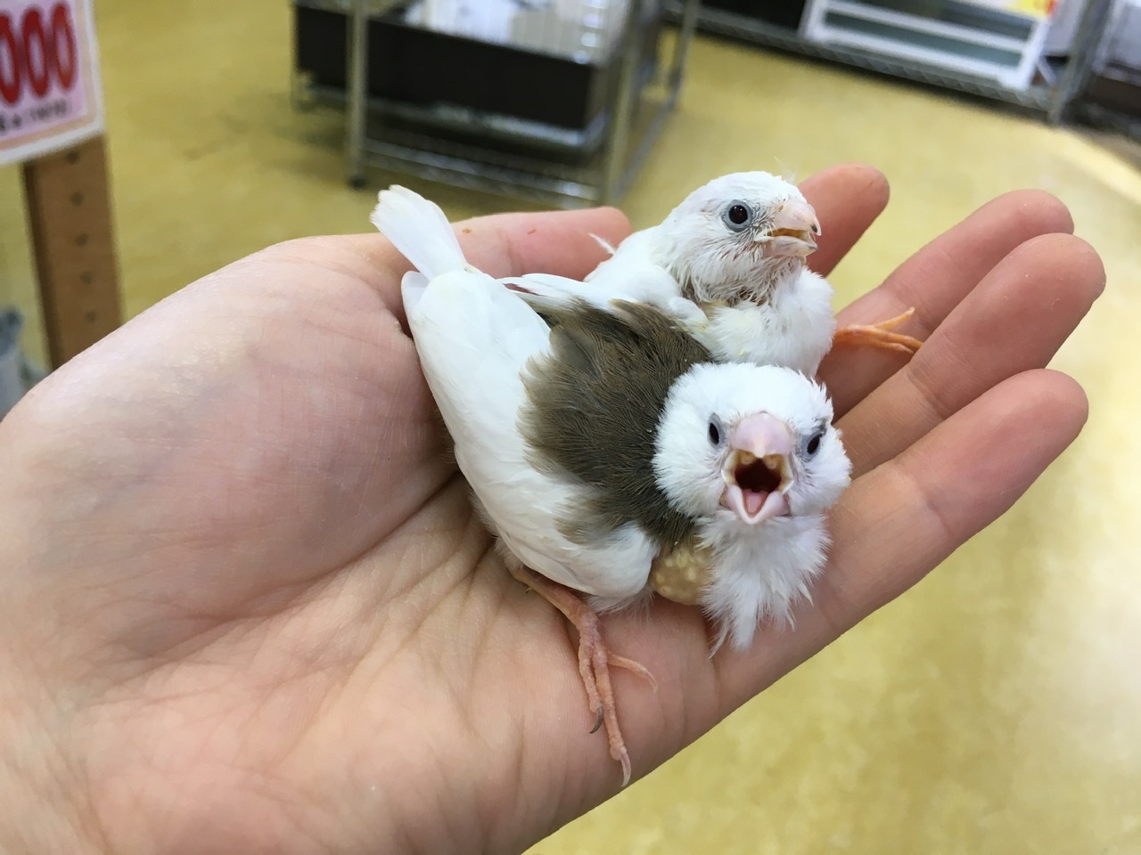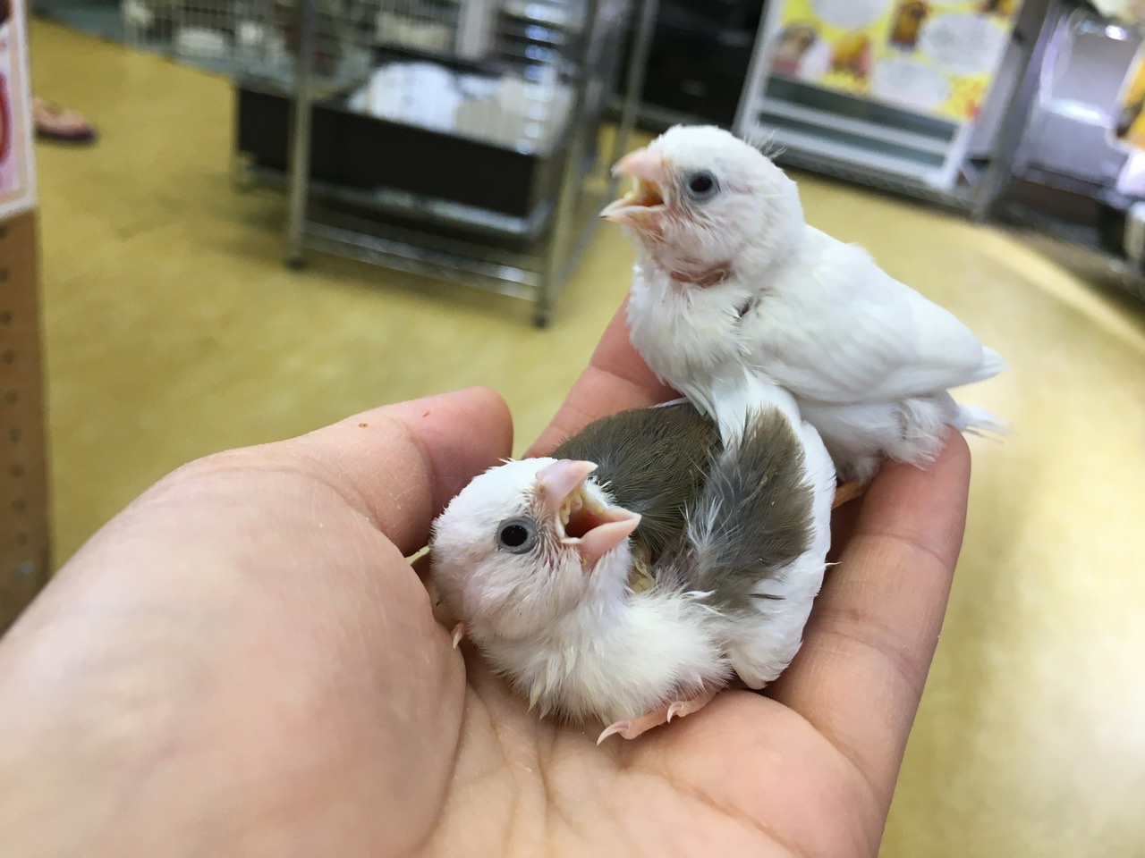 インター店あるあるのビックリヒナサイズで、綿毛どころかハゲハゲの子まで混ざっております😳こんなに小さいですが、さし餌はガッツリ食べてくれるので見た目によらず安心なのです♪♪
