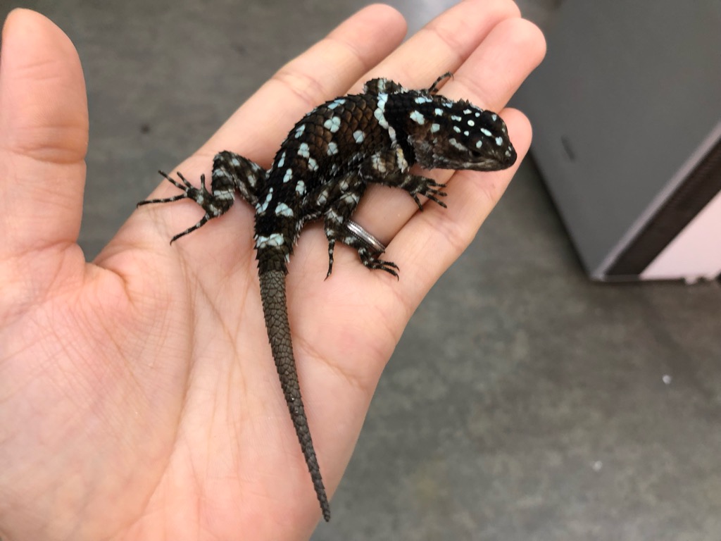 黒地に水色スポットは幼体とメスのカラー、この個体は変化前の