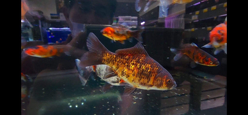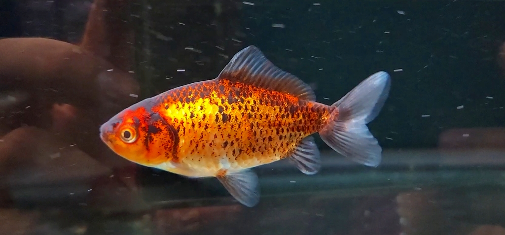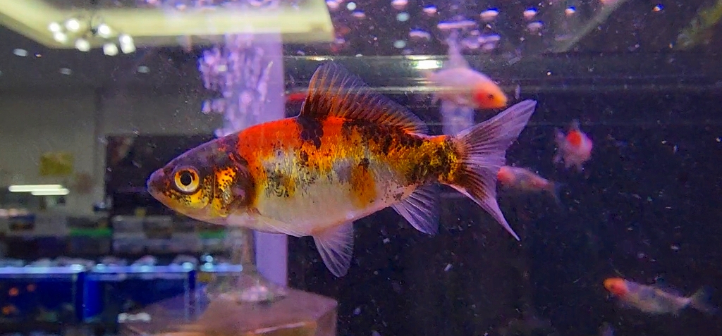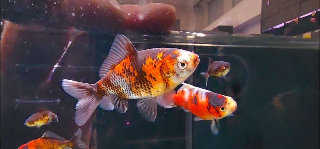 三色和金とは、明らかに違うカラートーン。尾の選別を厳しくされているため個体数も極稀です。横見でも異彩とオーラーを両方纏った、なかなかの和金。