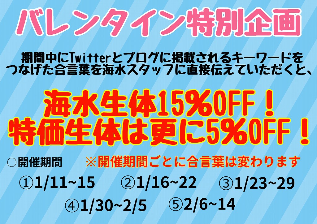 そして現在開催中の『バレンタインフェア特別企画』の合言葉を月末市当日に海水スタッフに伝えていただくとガチャの結果に+5%されます!!