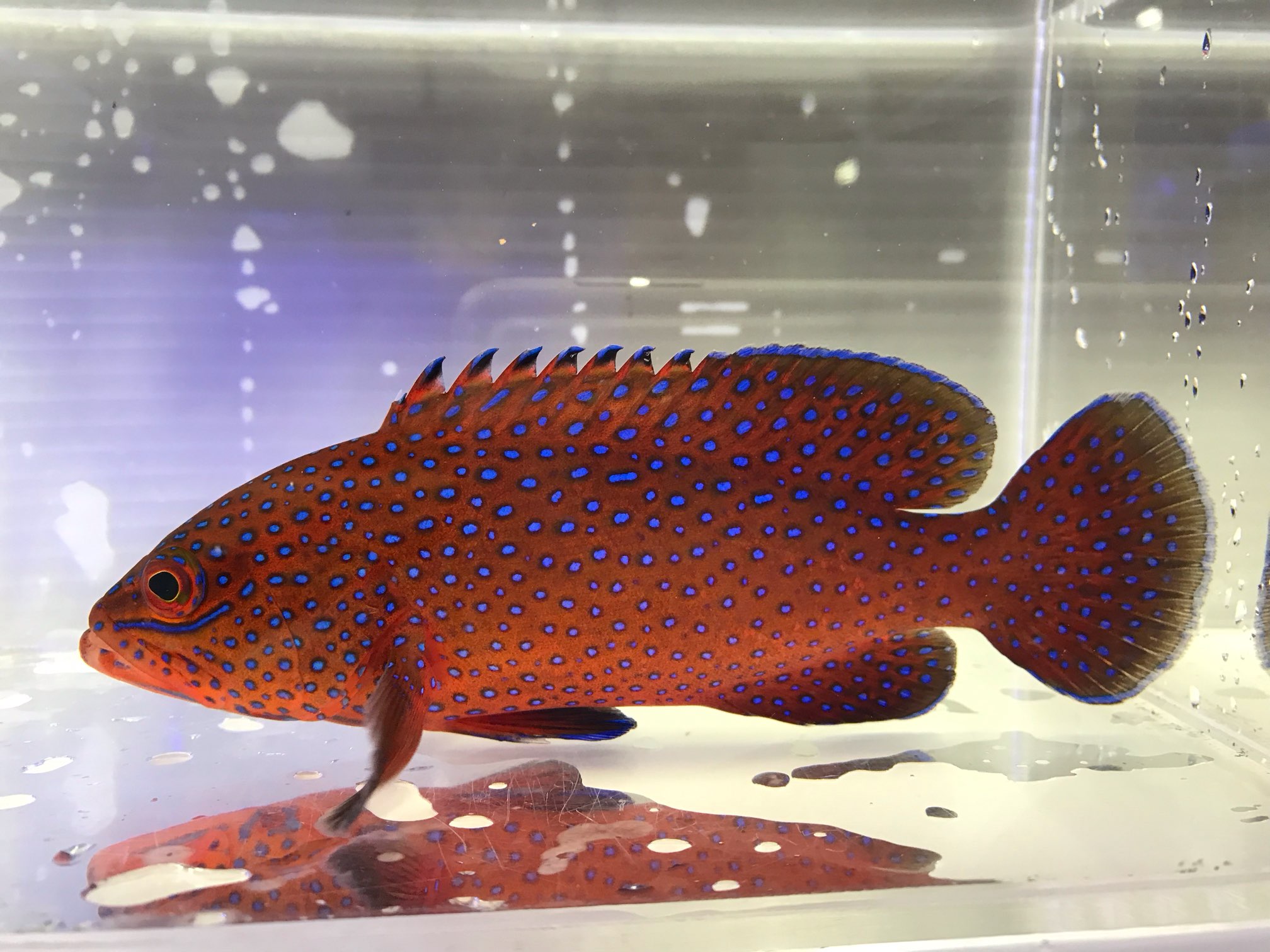 鮮やかな青色の斑点と赤い体色がとても綺麗
