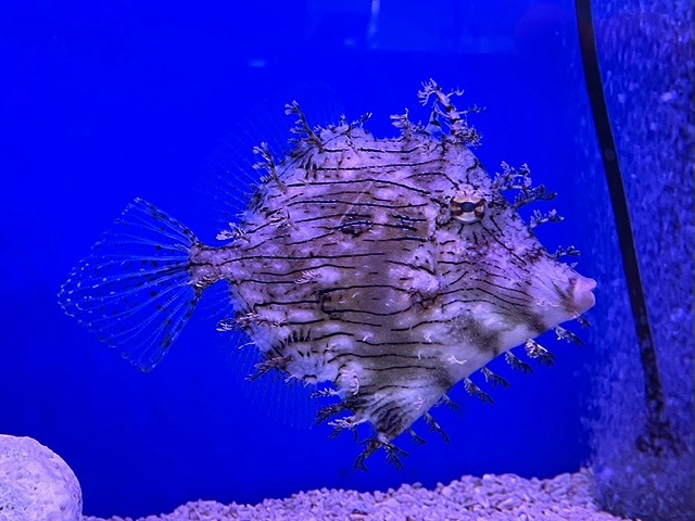 体の周りにヒゲのようなモジャモジャがたくさん生えている変わったハギ!自然界では流れ藻に擬態するユニークな生態をしています!