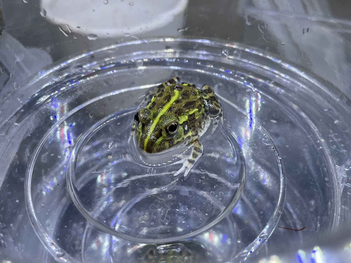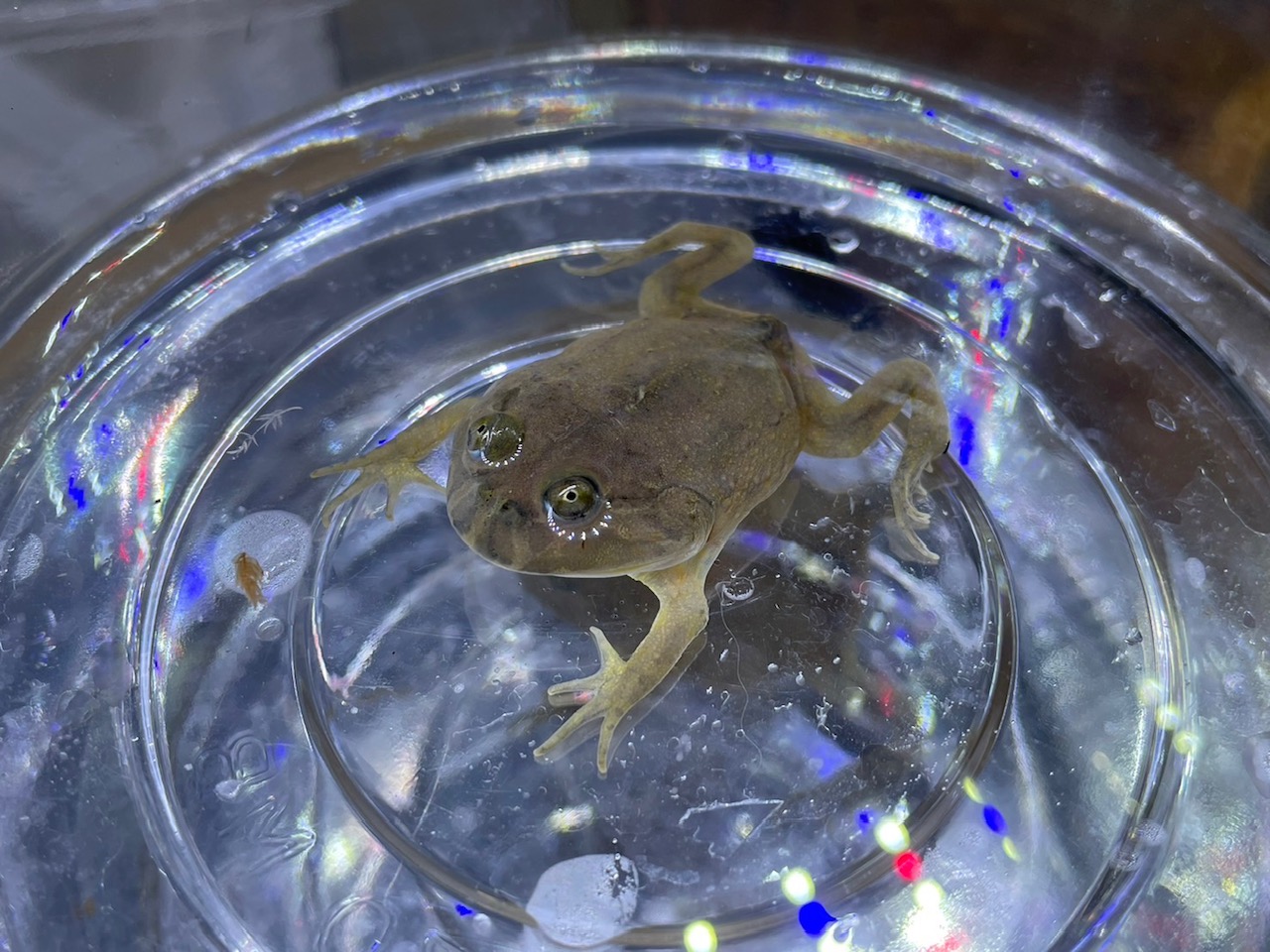 マルメタピオカガエル!冗談で付けたみたいな和名ですね。 完全水棲なので顔が出る程度の水深で飼育しましょう。