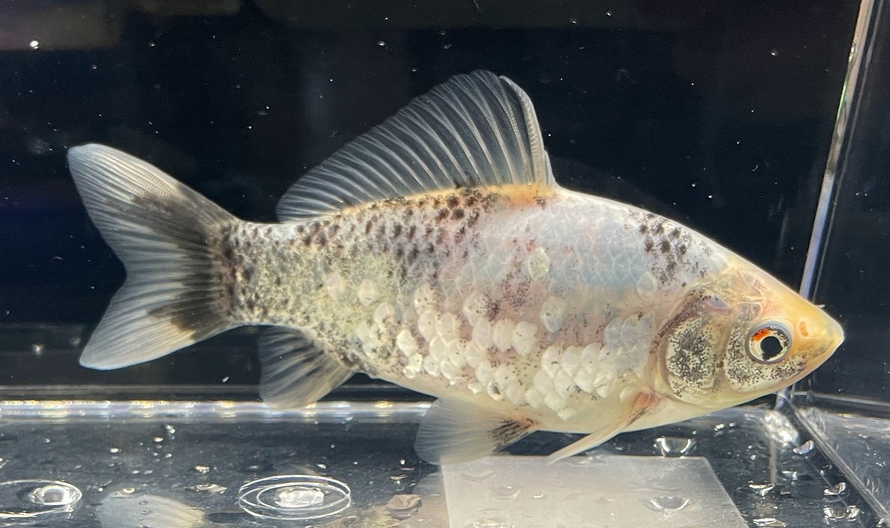 銀鱗の質、オレンジで留まりそうな独特なカラーリング。墨質も良く、他個体との明らかな発色の違いが見られるため、混泳でも存在感を失わない。