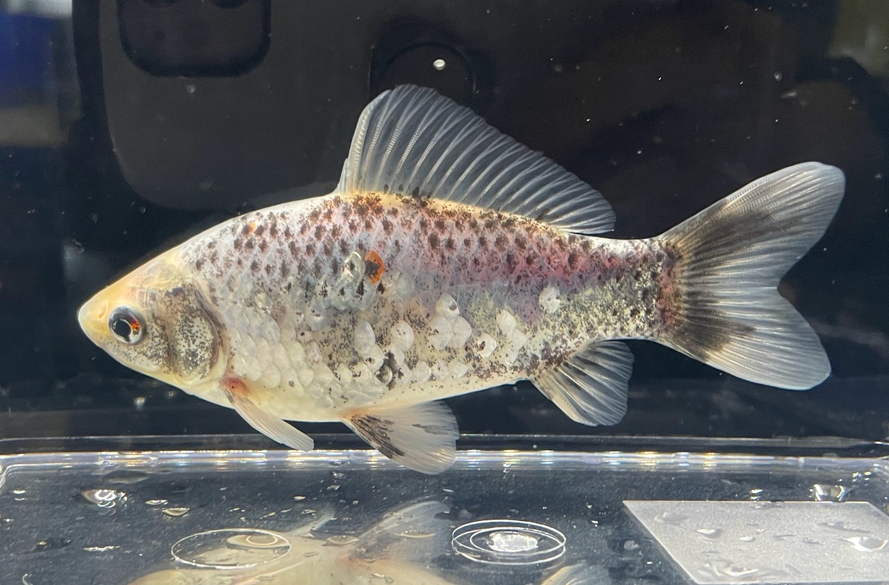 白黒墨和金を何タイプか見てきたが、この個体は1点物。さらに銀鱗が加わり艶が格段に違う。上見では気付きにくいが、コレクション性の高い美形な良個体。