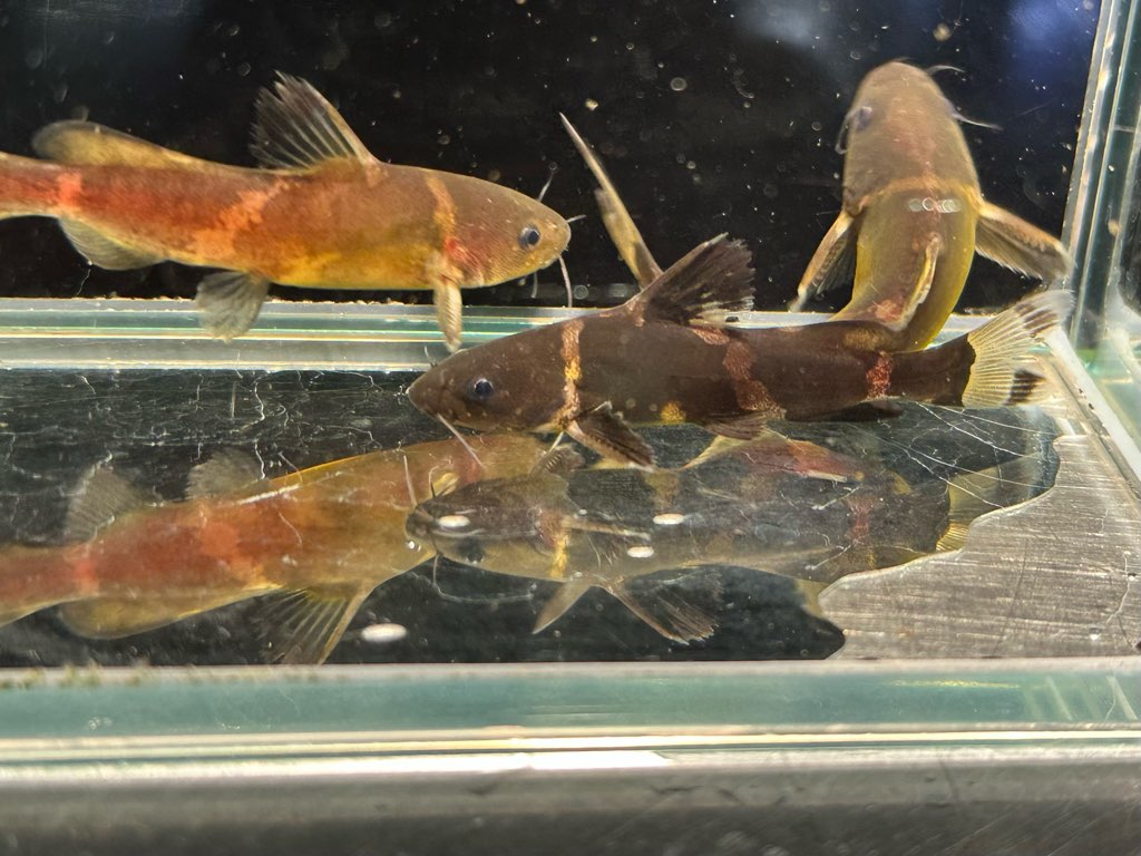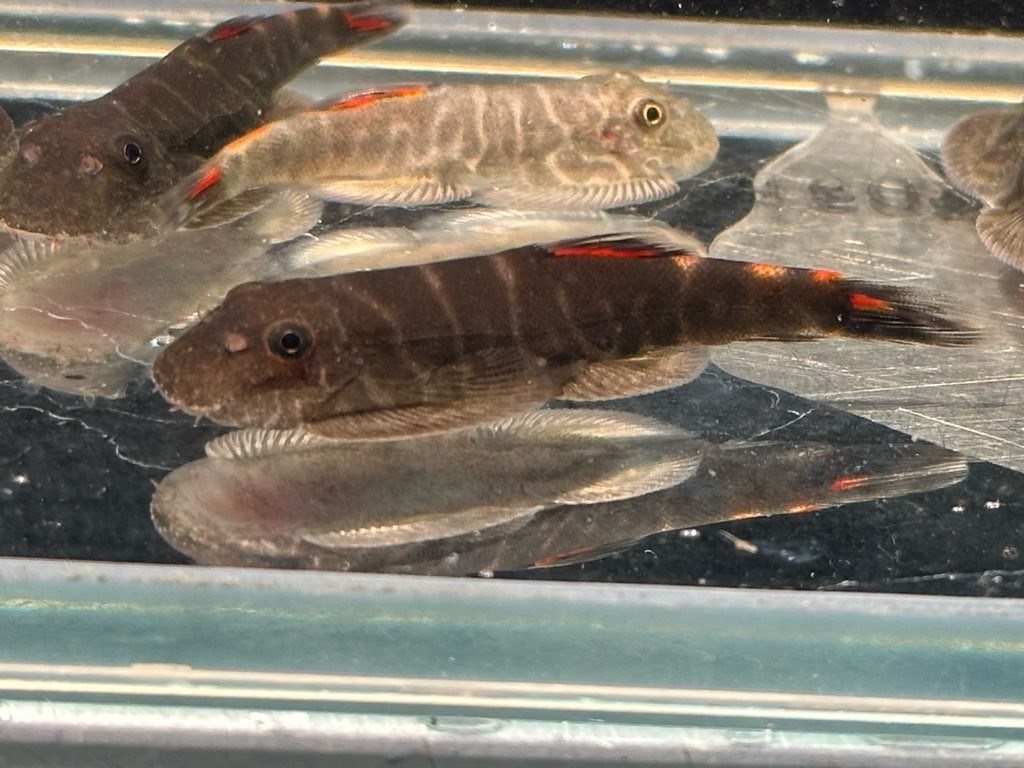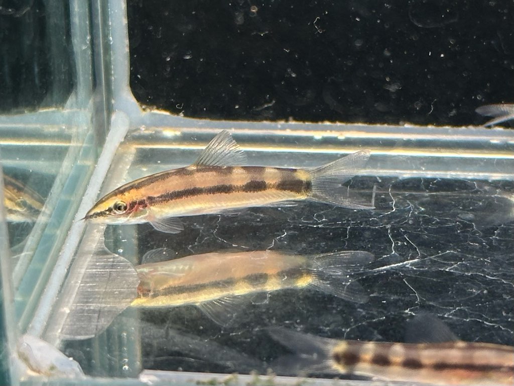 ブラッディマリーヒルストリームローチとも呼ばれるボルネオ産のタニノボリ。背鰭と尾鰭の付け根が赤く色付き、体にはストライプが魅力的なお魚。