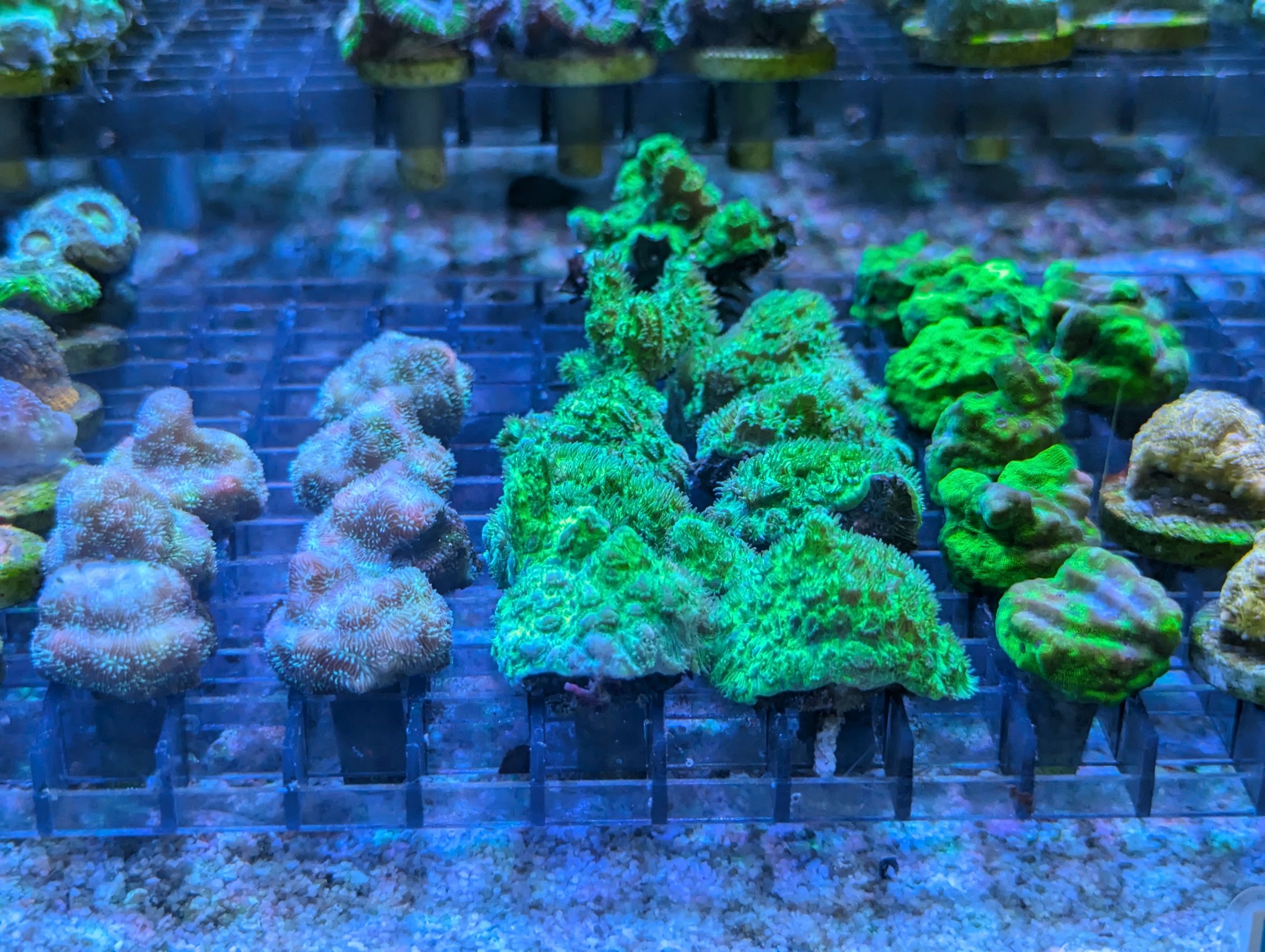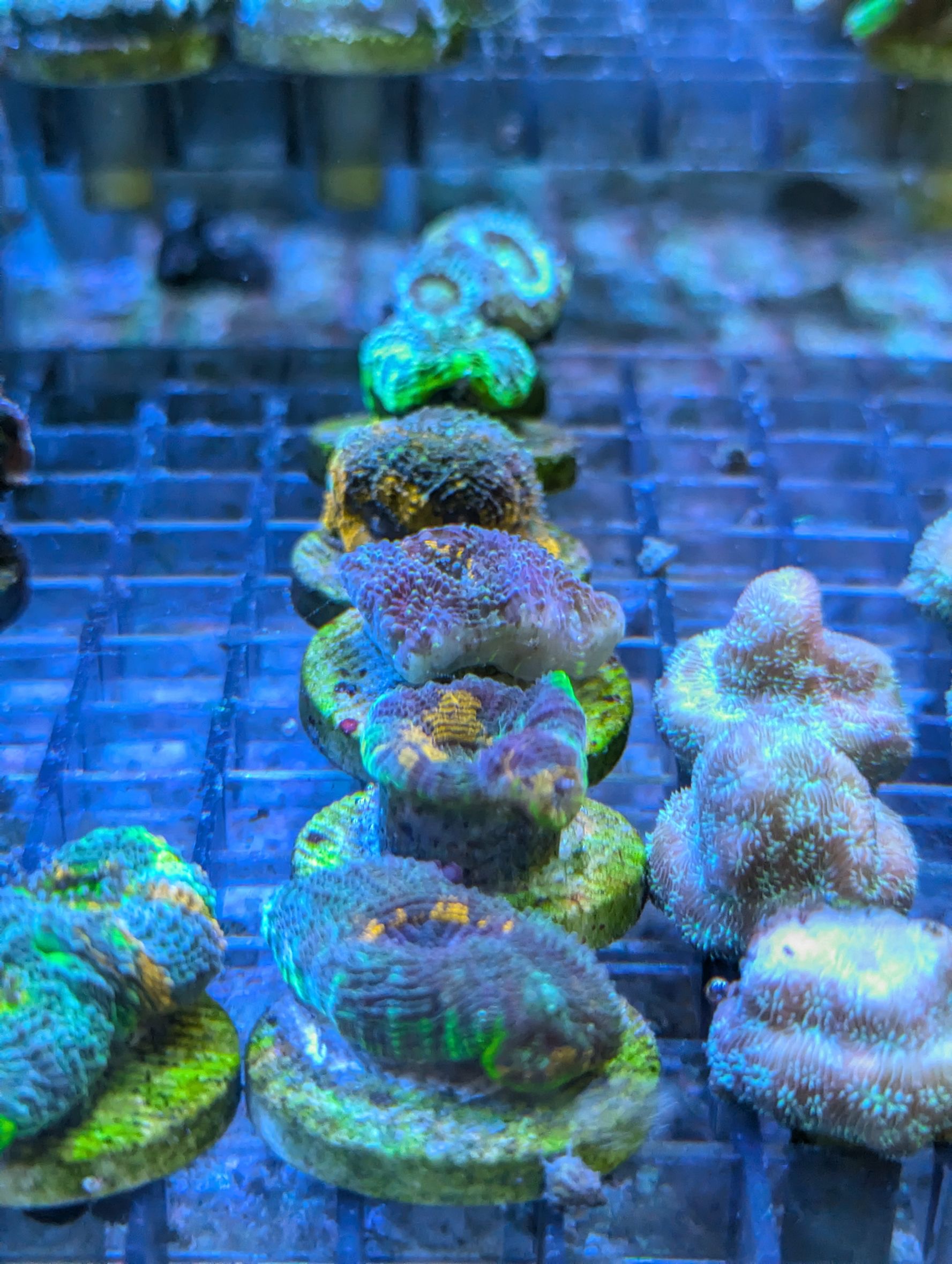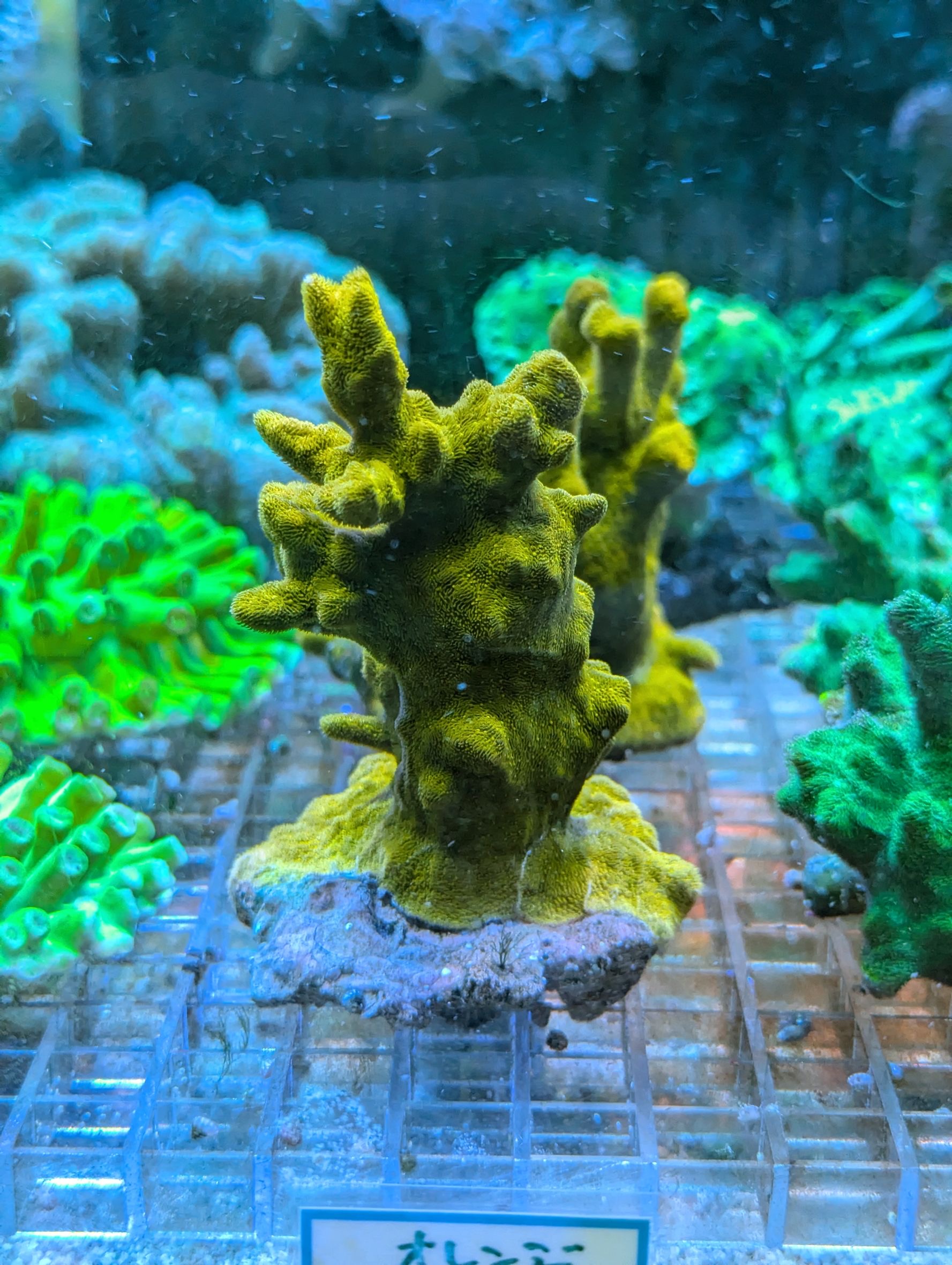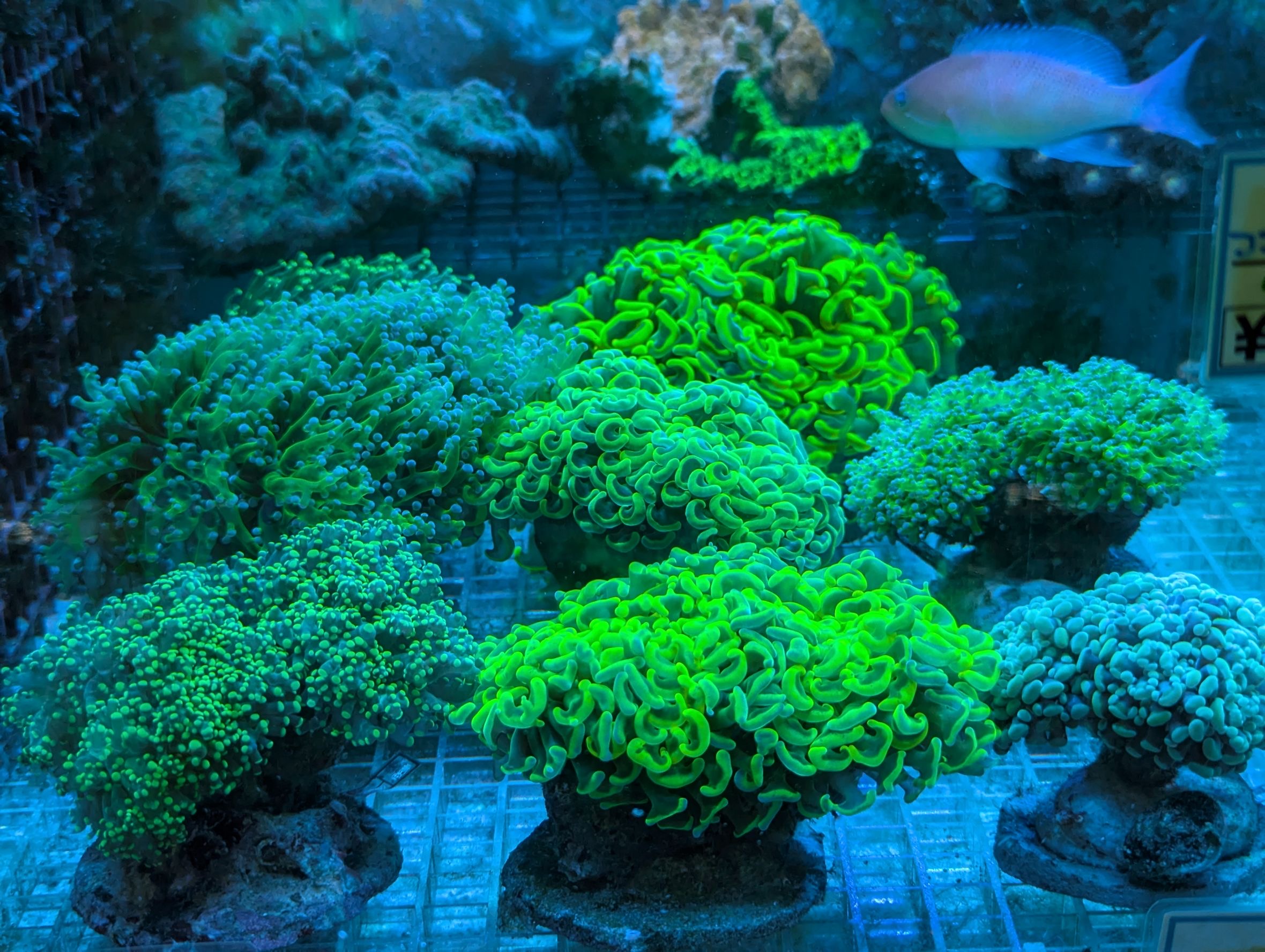 ←左から ノウサンゴ・アミメサンゴ(グリーン)・アミメサンゴ(オレンジ)・カノコキクメイシ・キクメイシ・アミメサンゴ(ゴールド)