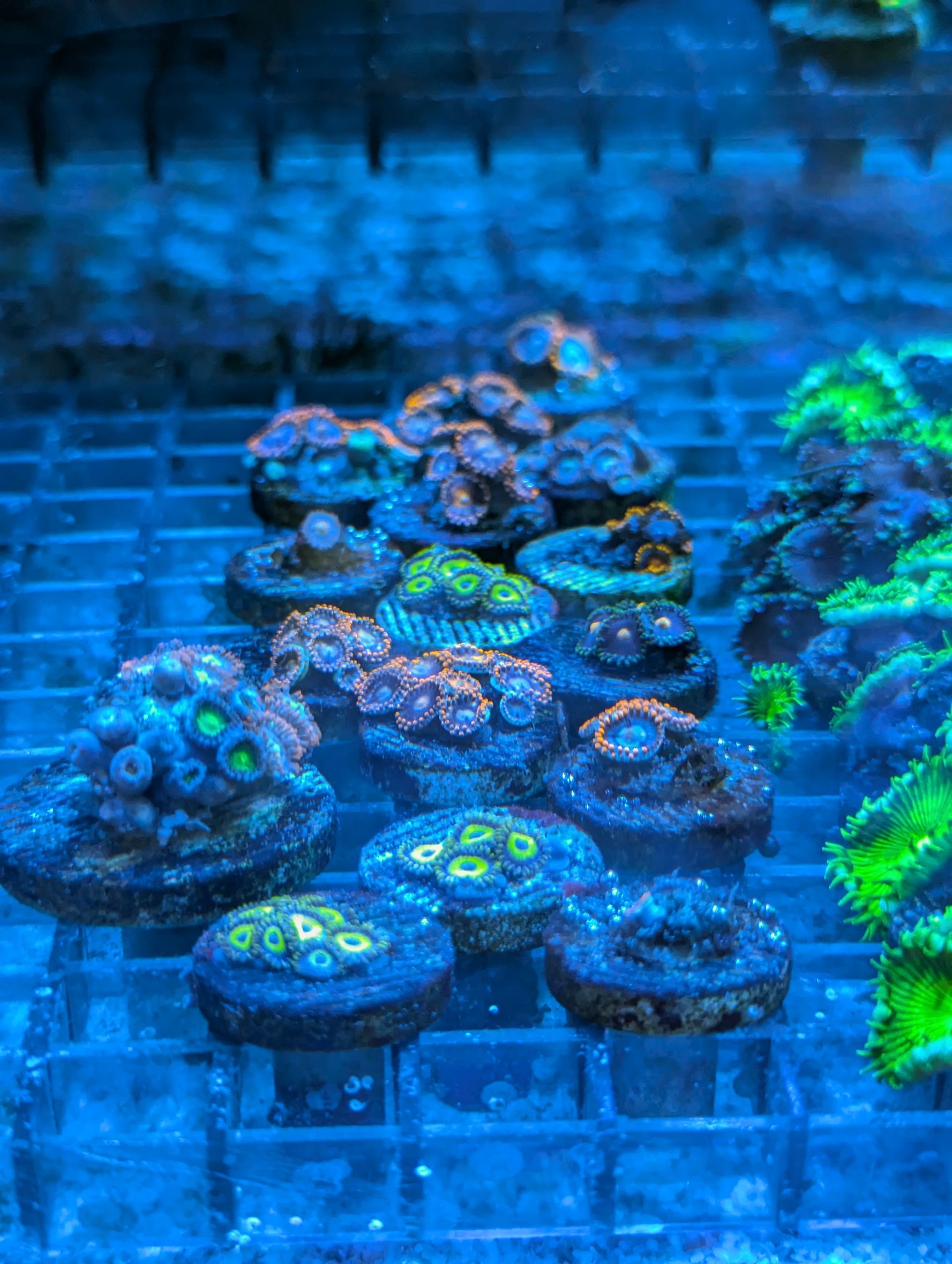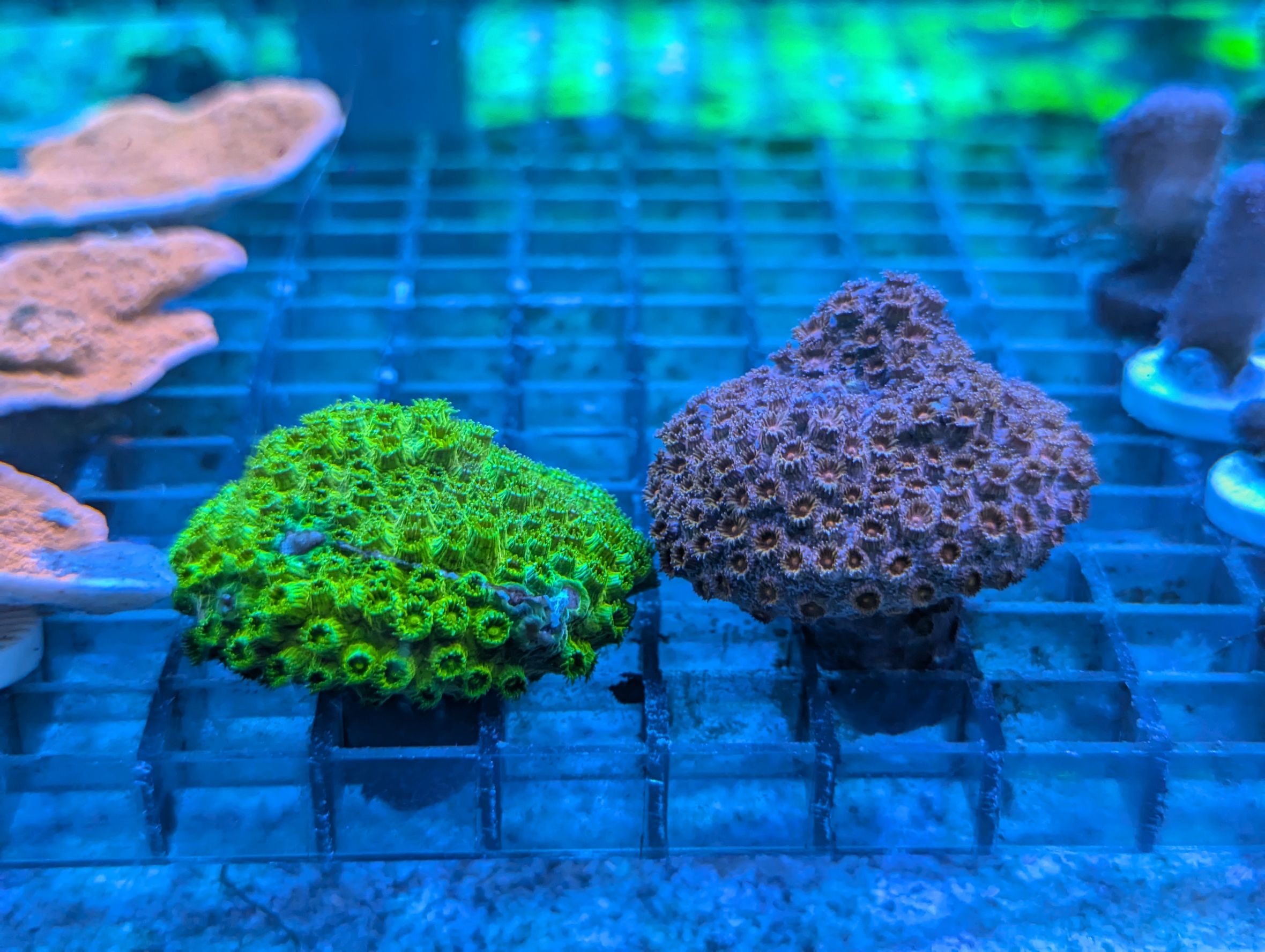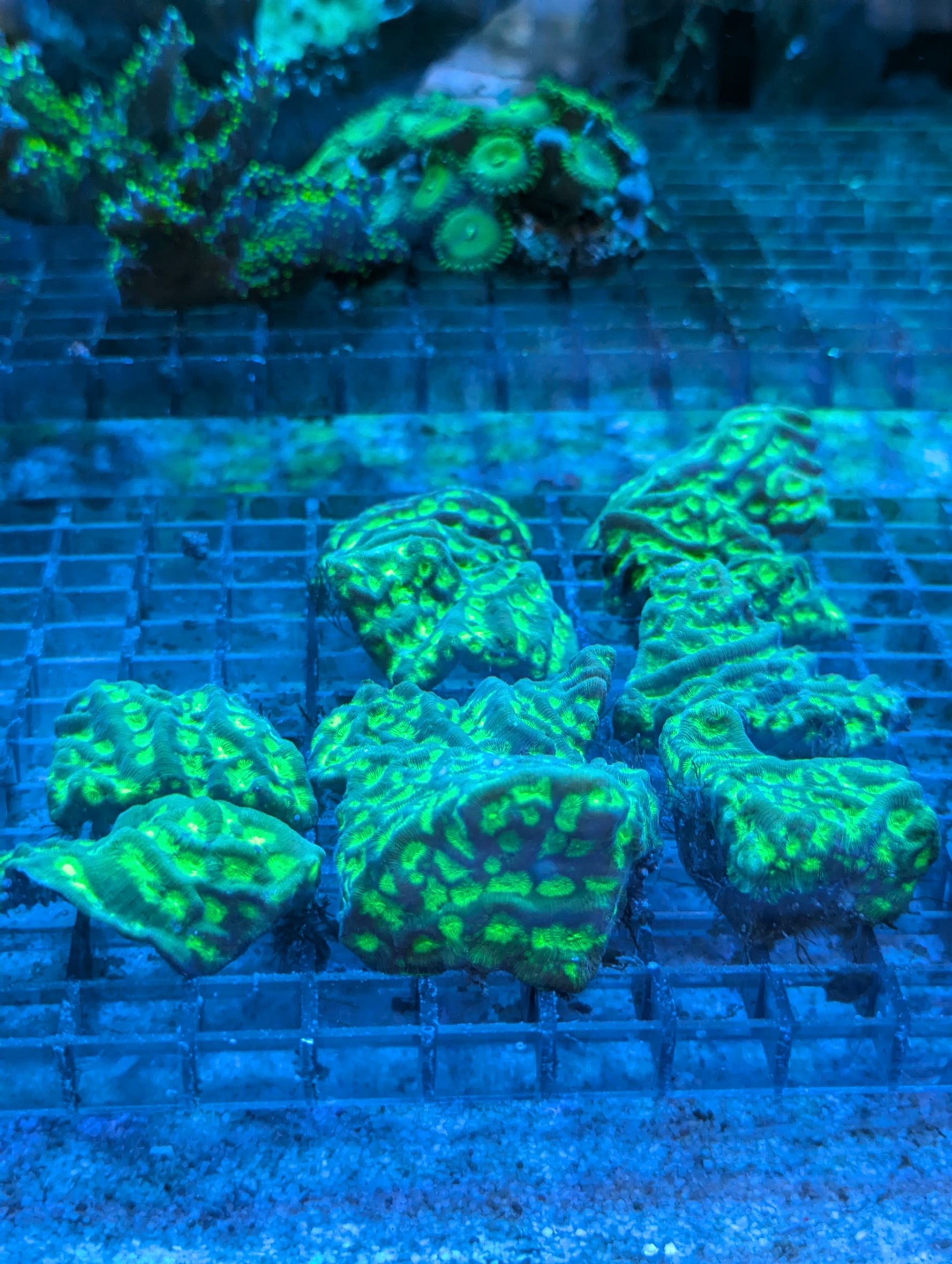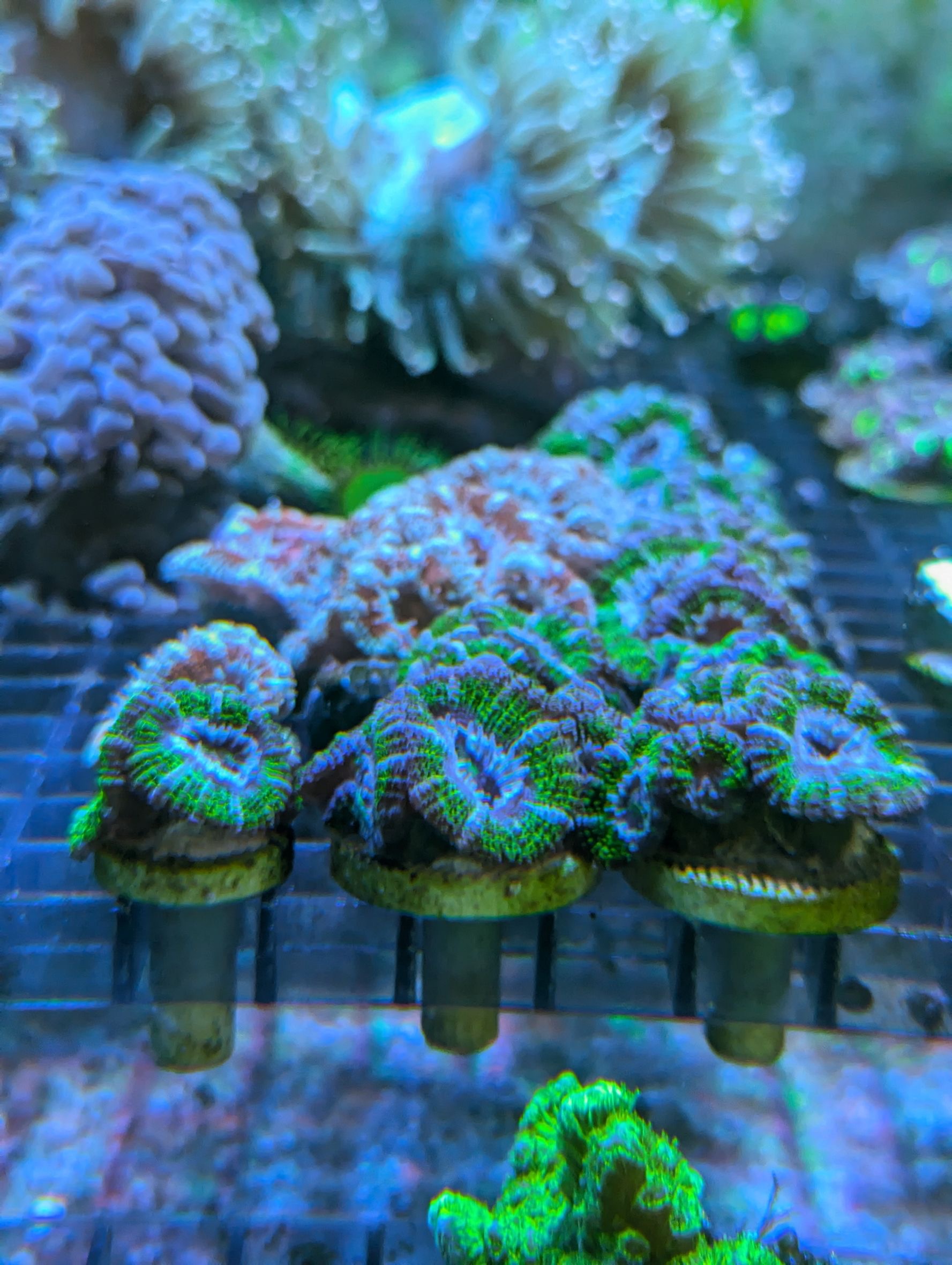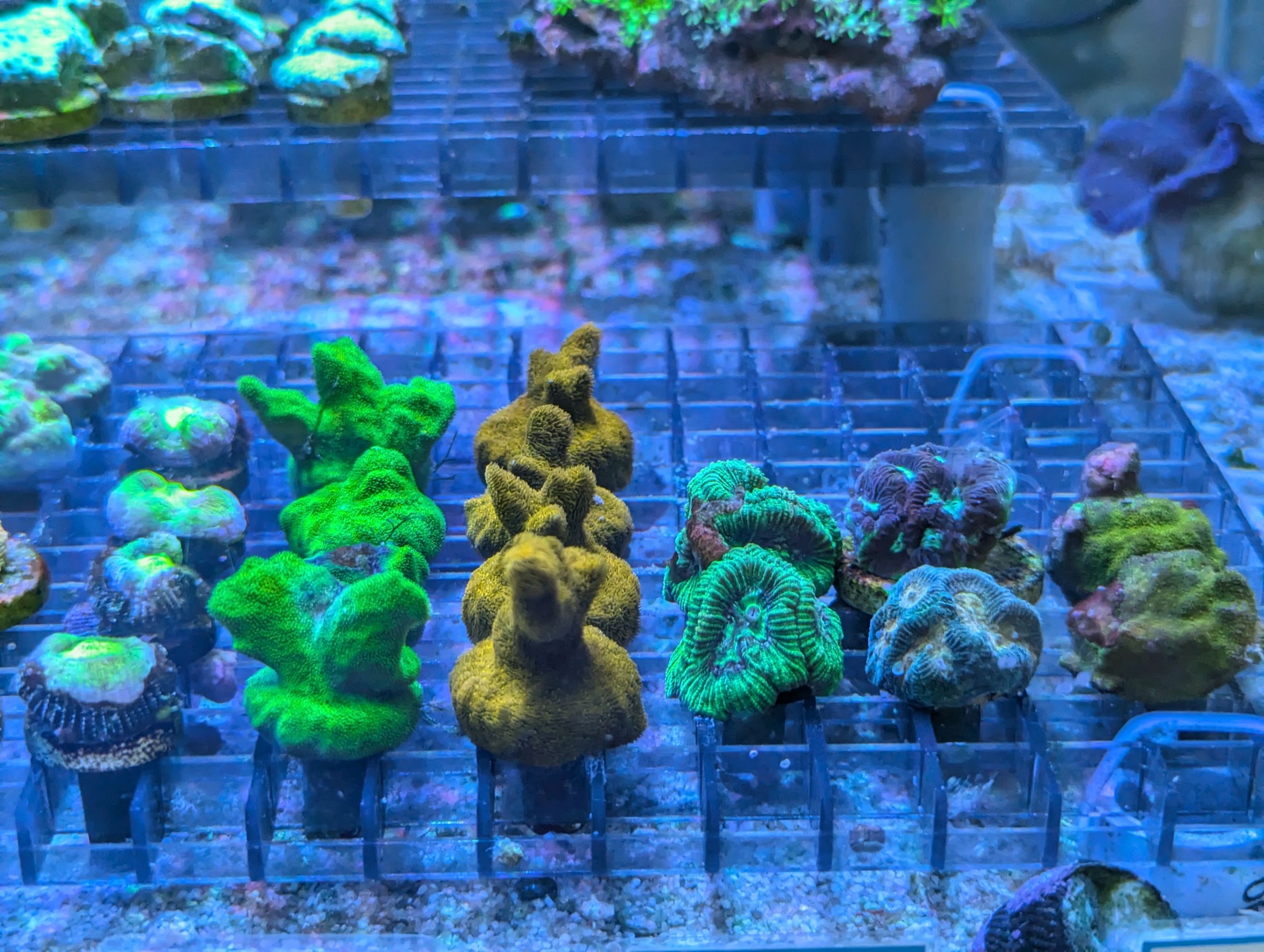 ←左から ノウサンゴ・アミメサンゴ(グリーン)・アミメサンゴ(オレンジ)・カノコキクメイシ・キクメイシ・アミメサンゴ(ゴールド)