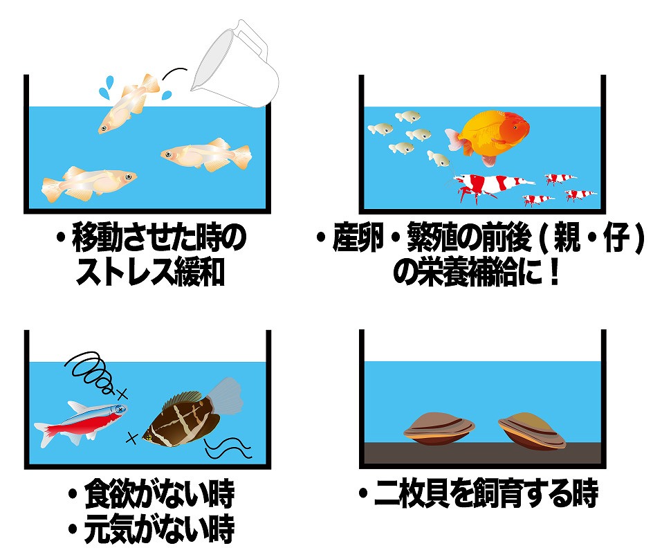 豊富なアミノ酸とビタミンを手軽に補え、毎日、エサやりにプラスするだけで、魚の稚魚から親魚、エビ、二枚貝などあらゆる生体の健康をしっかりとサポート!