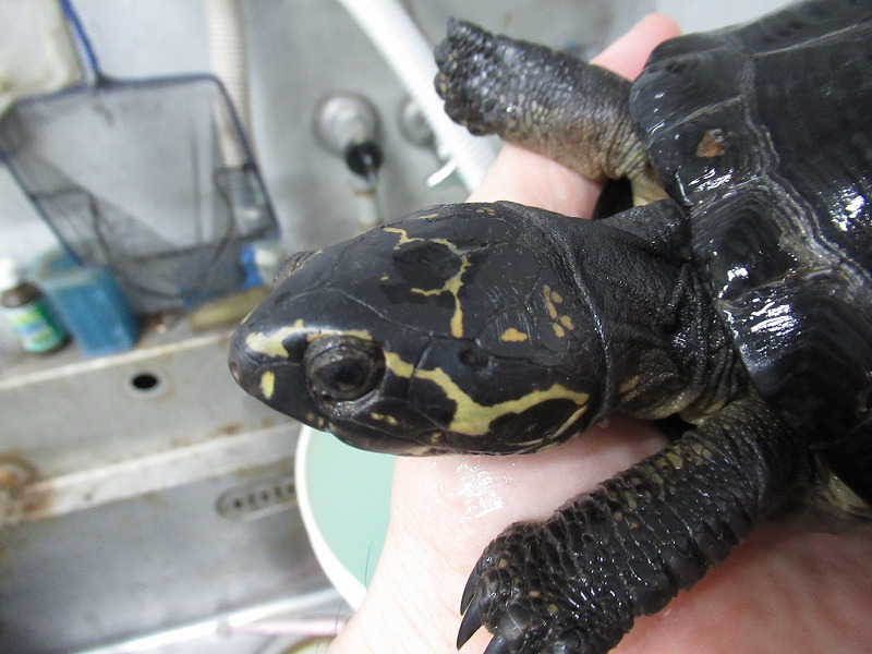 いつも人気のオカバンゴも到着!最近の小さめサイズではなくヤング。雌雄も多分大丈夫だと思います。ハコヨコクビガメの主役級のひとつで、幅広なふくれっ面には黄色い柄がくっきり。体色も真っ黒なので黄色の柄が際立って綺麗です。黒目がちなウルウルな瞳も可愛らしいです。