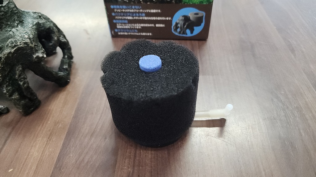 この商品はスポンジフィルターもセットのため、このままエアポンプに繋げればOKです。エアポンプコーナーにて販売中、3個限定。