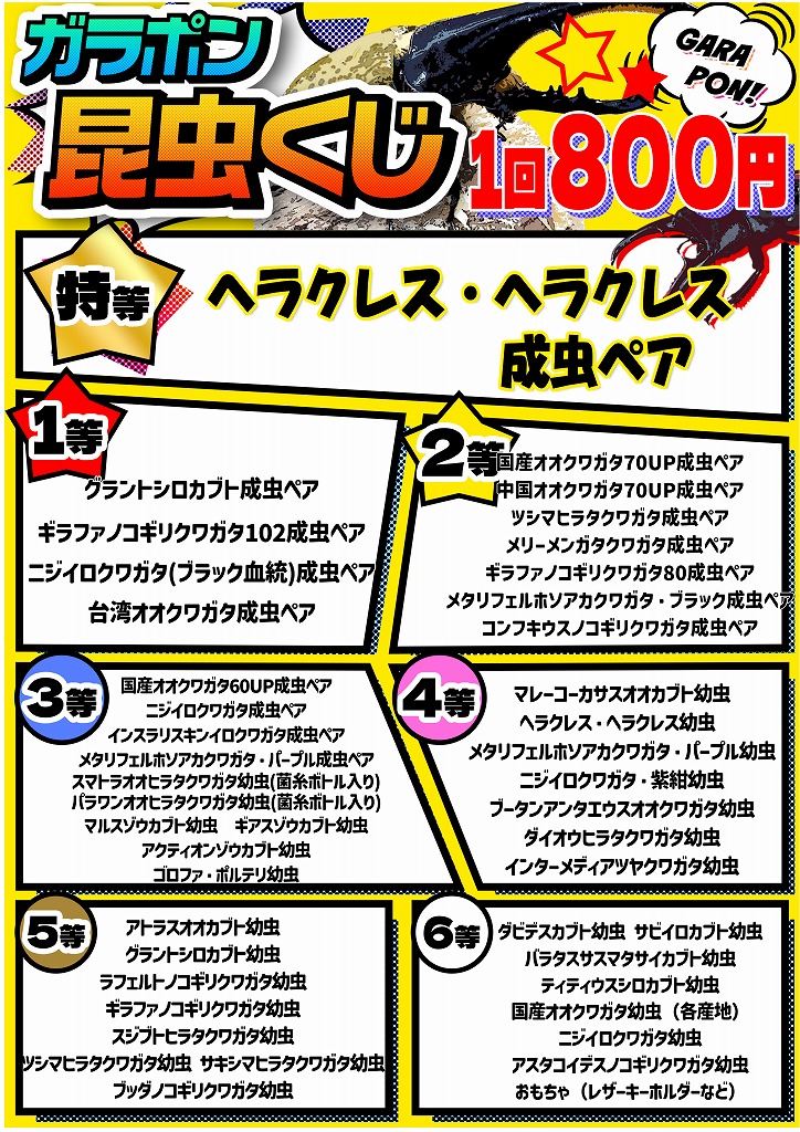 特等にはもちろん、『ヘラクレスオオカブト成虫』をご用意!