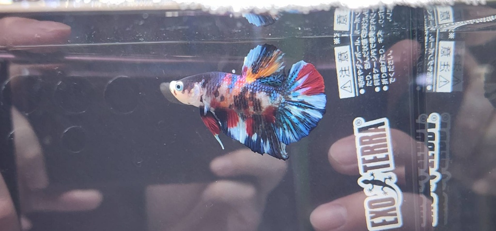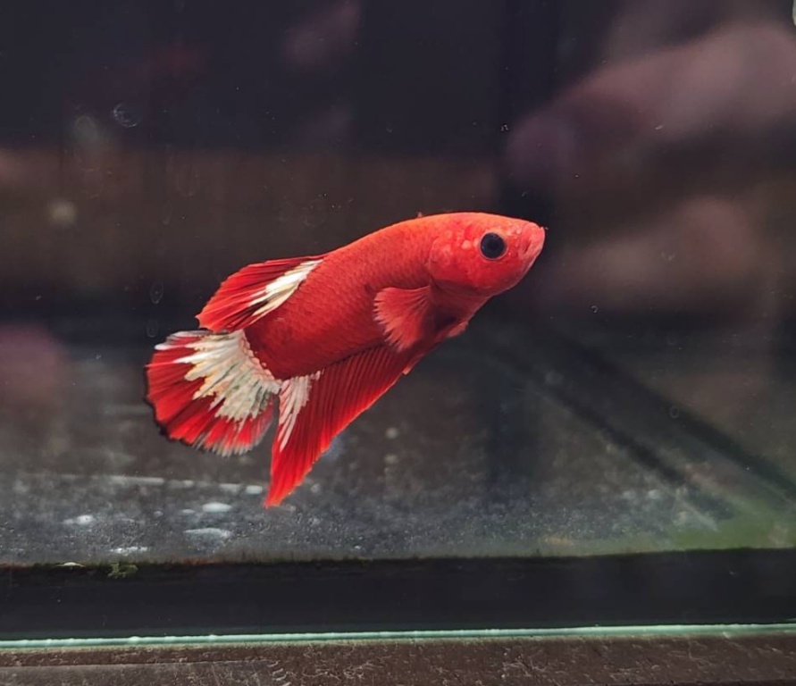 写真では分かり辛いですが、尾鰭の柄が放射状に入る比較的新しい品種。フレアリングさせると印象が変わります。