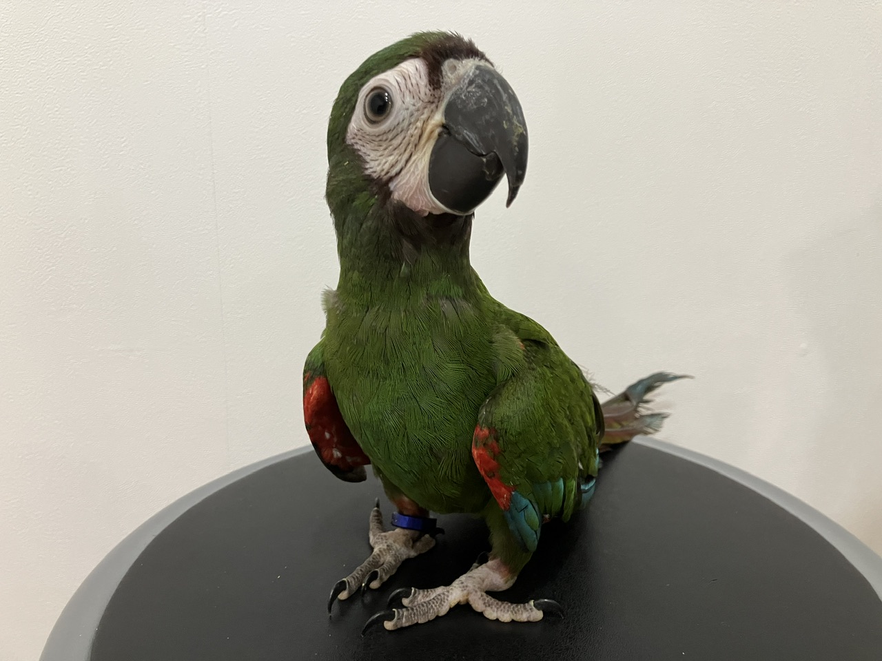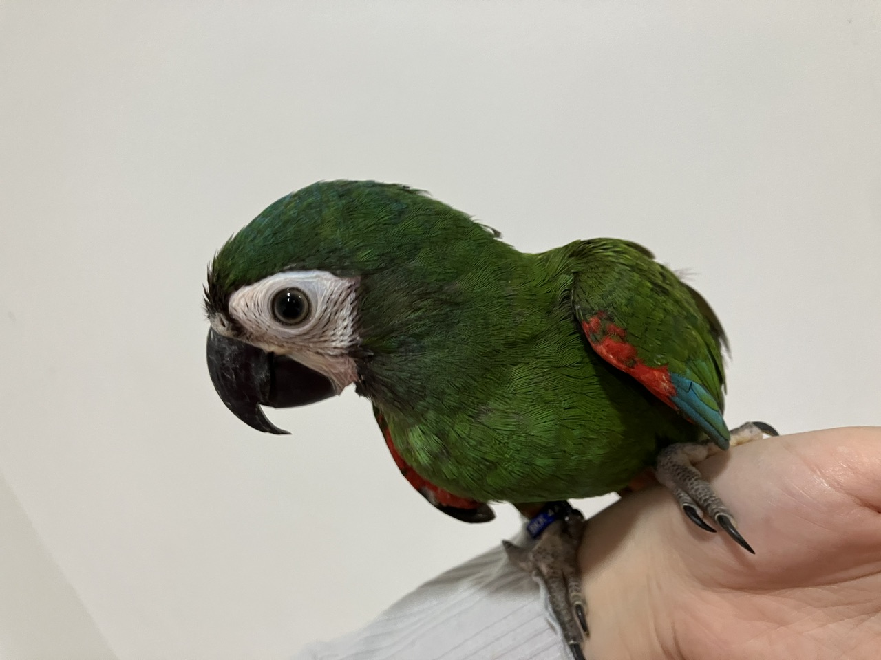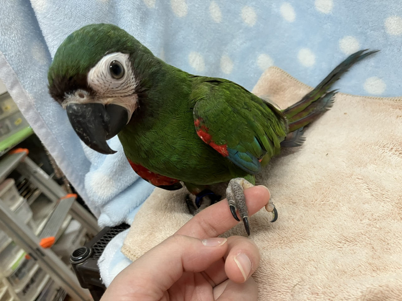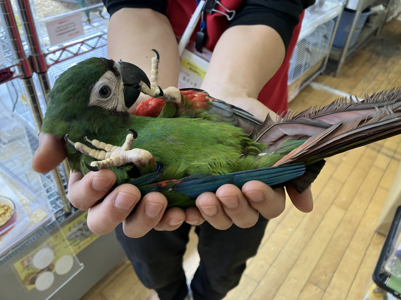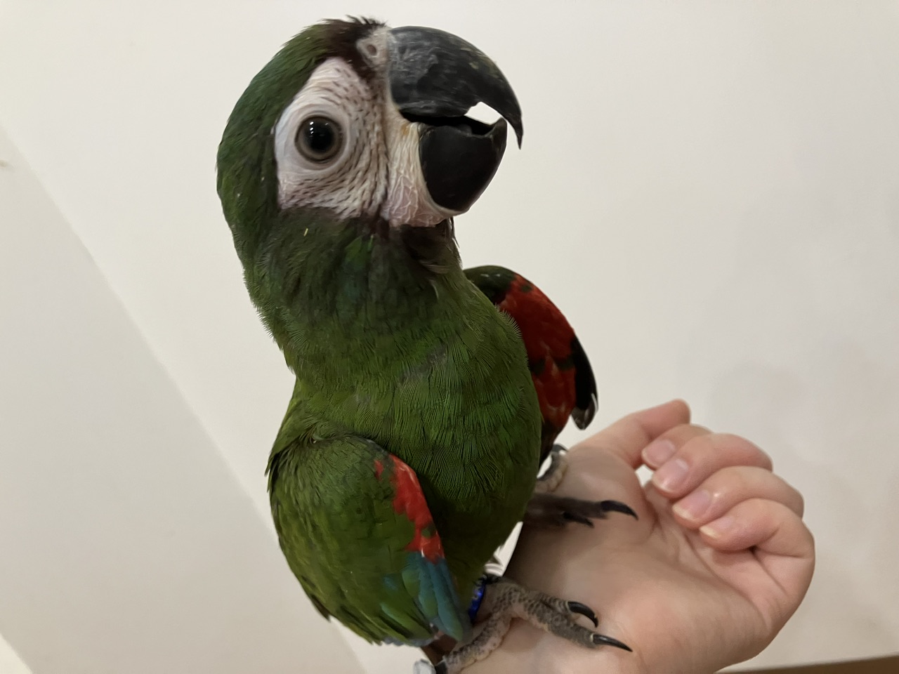 まだヒナ寄りの若鳥といったサイズですが、がっしりした脚にコンゴウインコ独特の白い顔……すでに迫力がすごいです😳