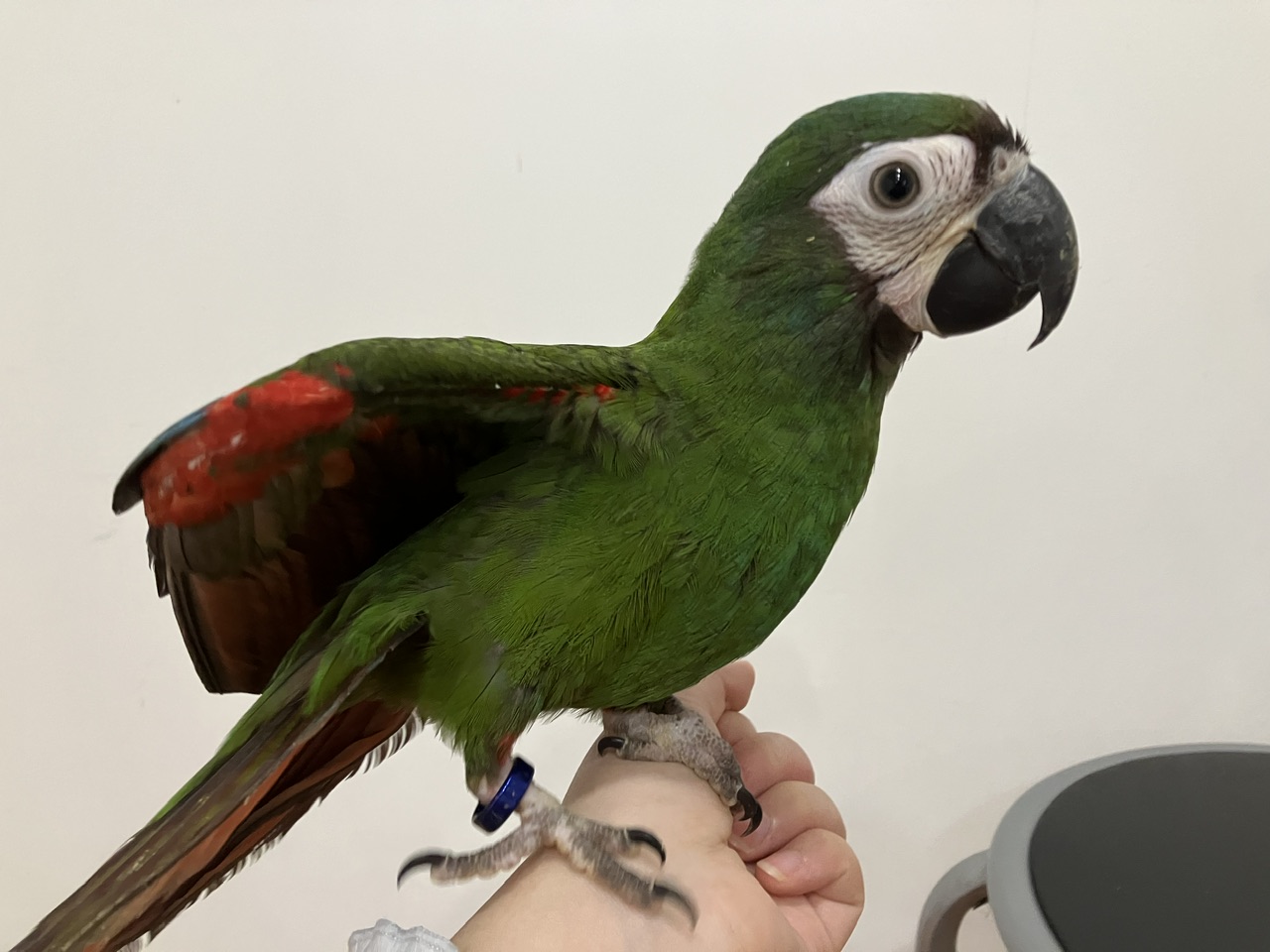 全体的に濃い緑色をしているため他のコンゴウインコと比べると落ち着いた色に見えますが、羽の内側には鮮やかな赤色や黄色が隠れています👀✨大きく羽を広げると印象が一気に変わって見えるのがポイントですよ♪♪