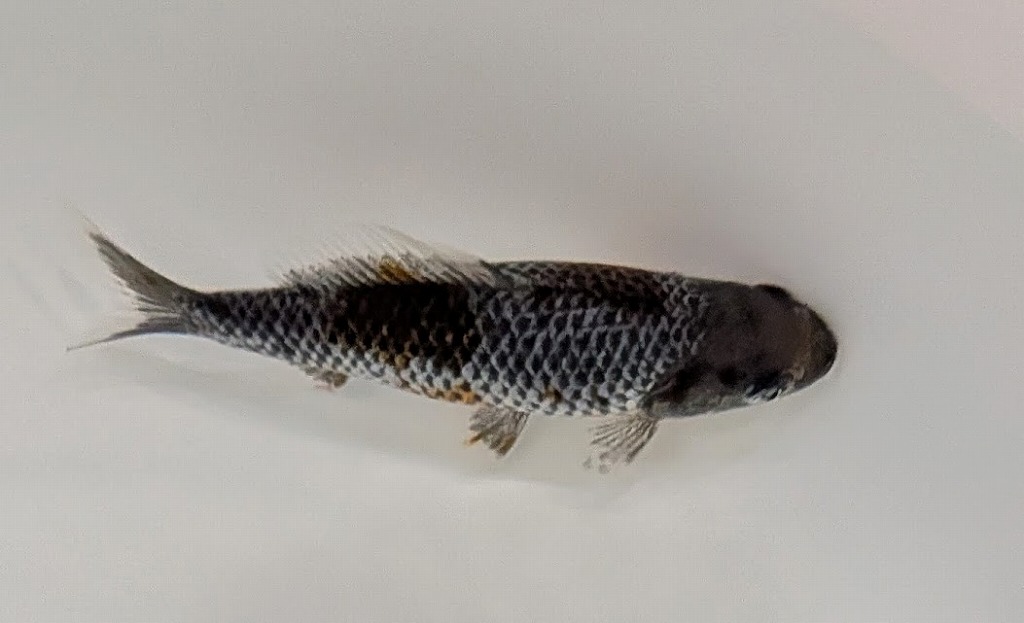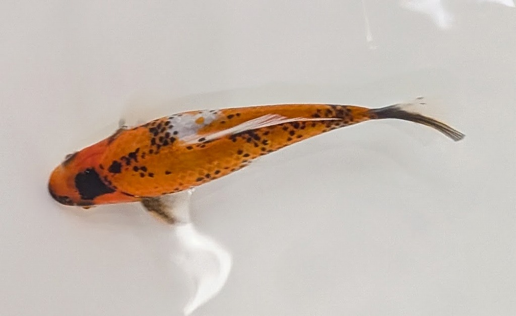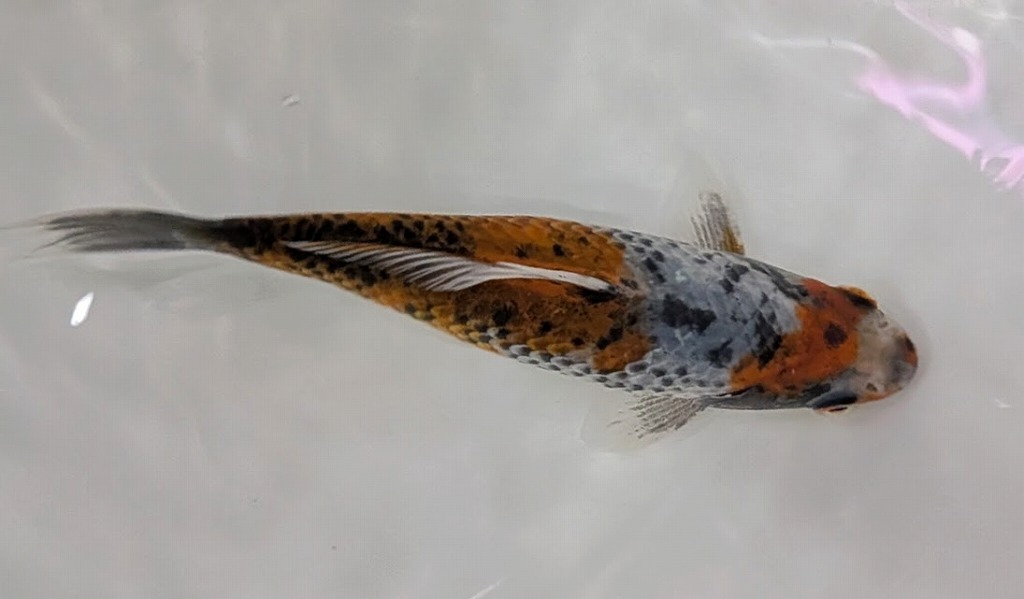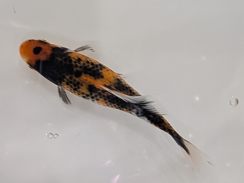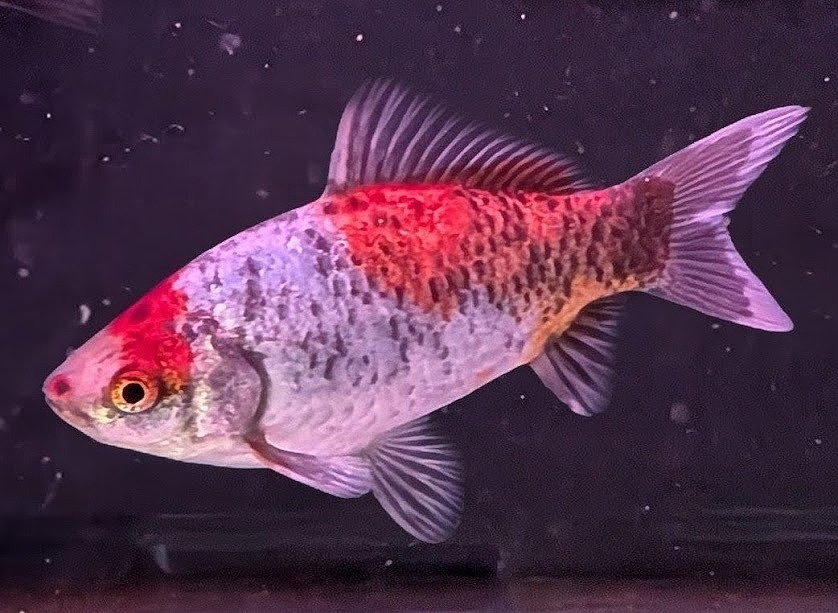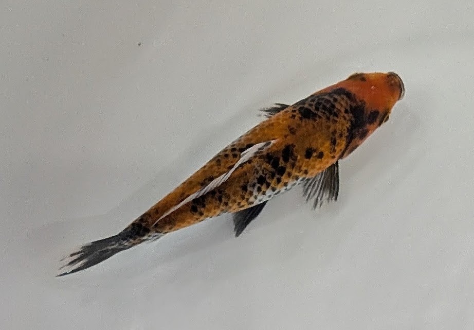腹部を中心に散らばる墨鹿の子と体側の銀鱗。背ビレ付根後半~尾筒を掴むように覆う緋色の美しい個体です!背の鱗が控えめにされた事で浅葱が鮮明に映る点と各鰭墨のコントラストの良さ。表現レベルのそれぞれが贅沢な1匹です!