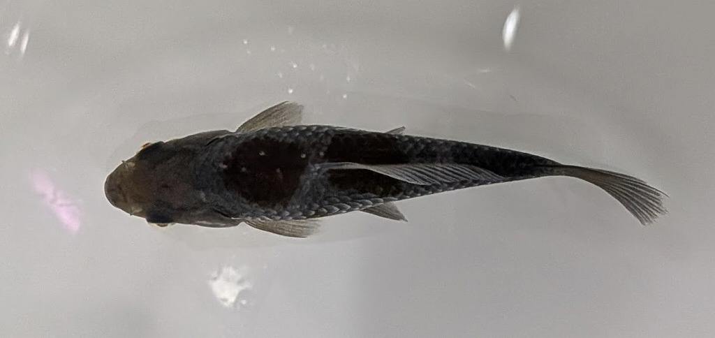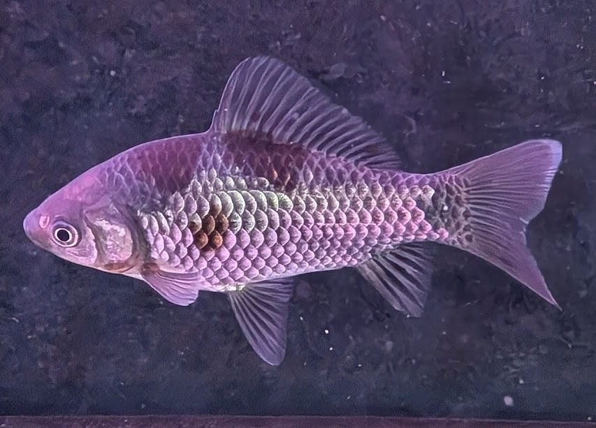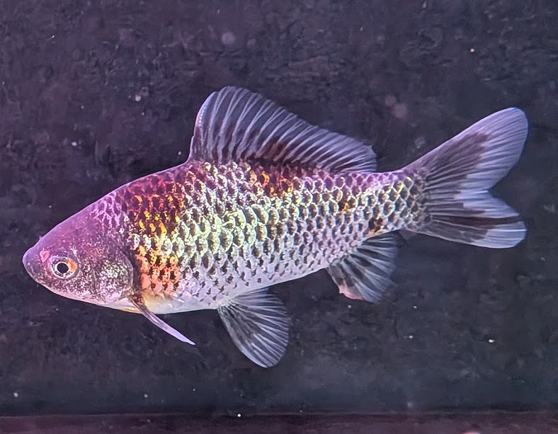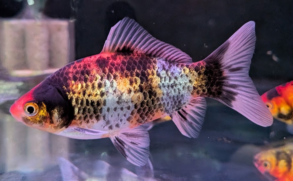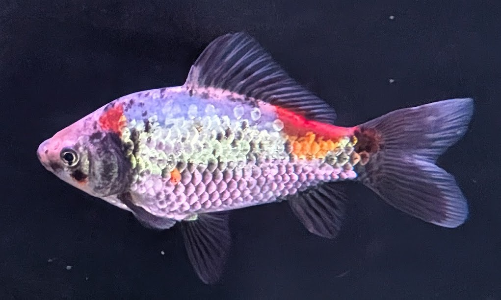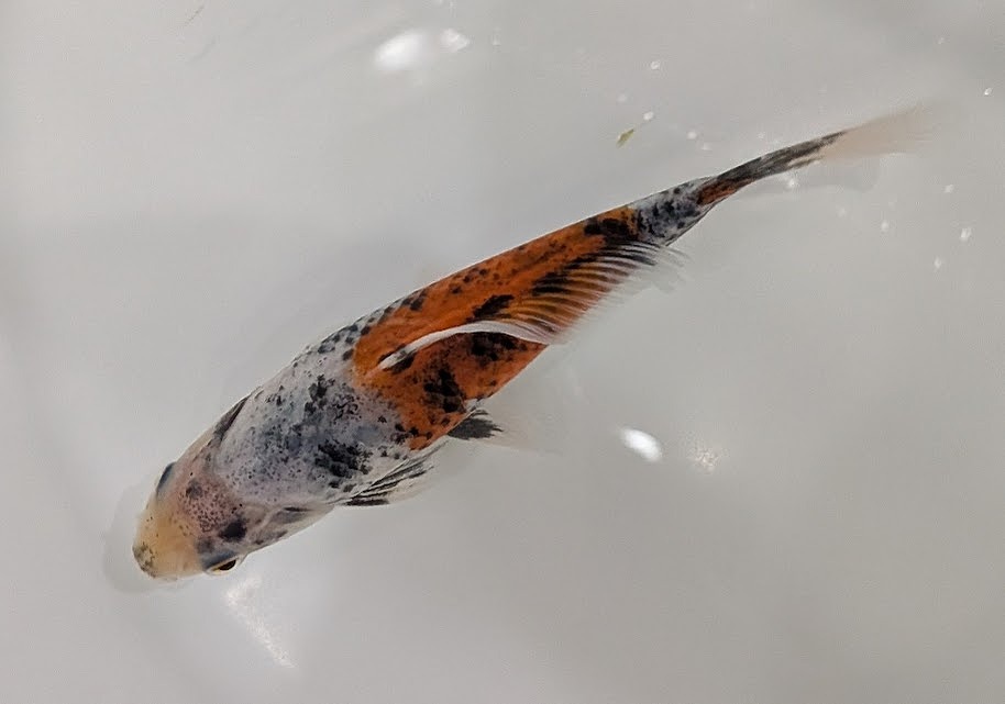 腹部を中心に散らばる墨鹿の子と体側の銀鱗。背ビレ付根後半~尾筒を掴むように覆う緋色の美しい個体です!背の鱗が控えめにされた事で浅葱が鮮明に映る点と各鰭墨のコントラストの良さ。表現レベルのそれぞれが贅沢な1匹です!