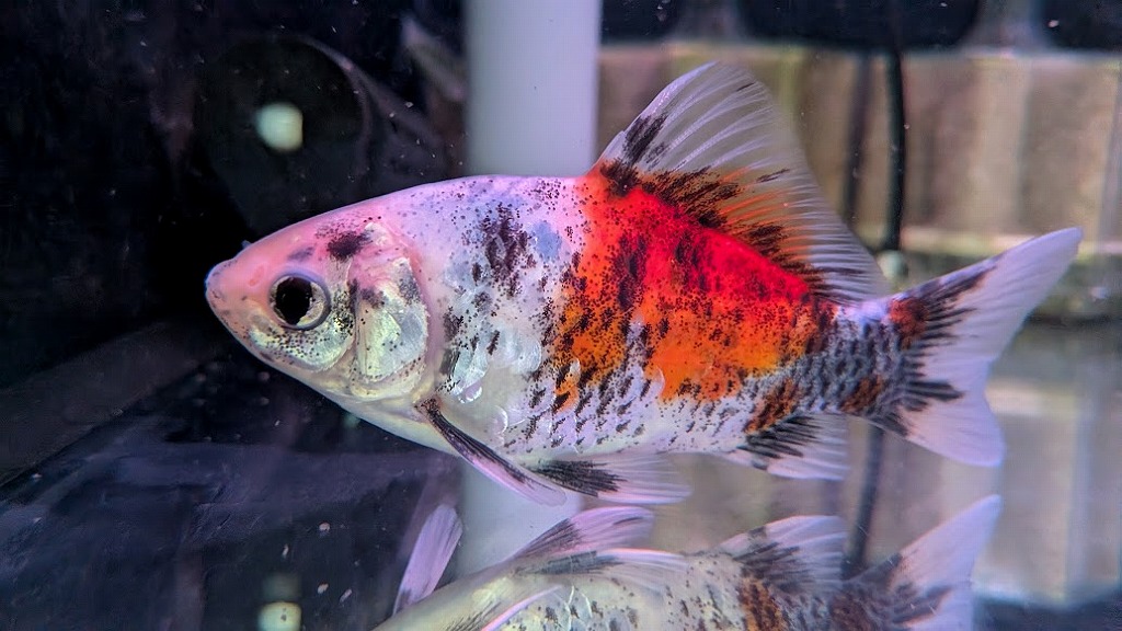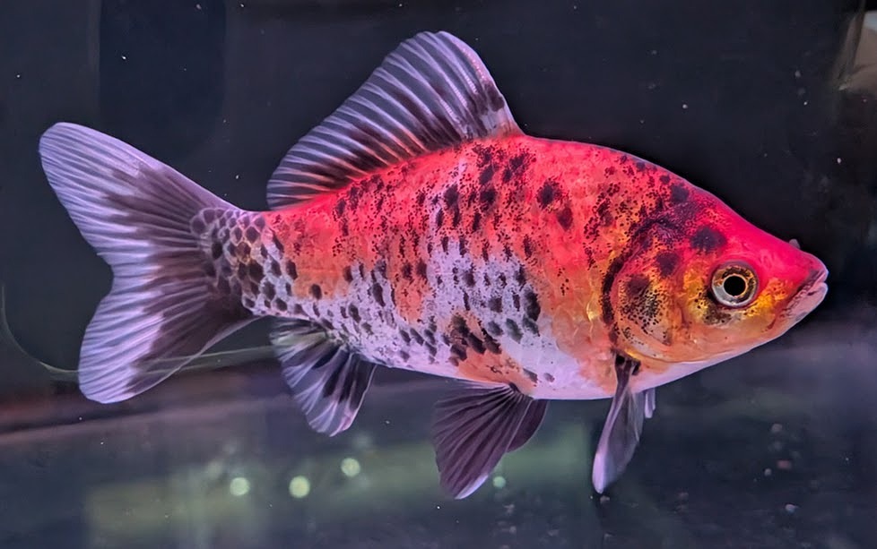 鮮やかな緋体色に、鹿の子調に散りばめらた墨入りの優美魚です!