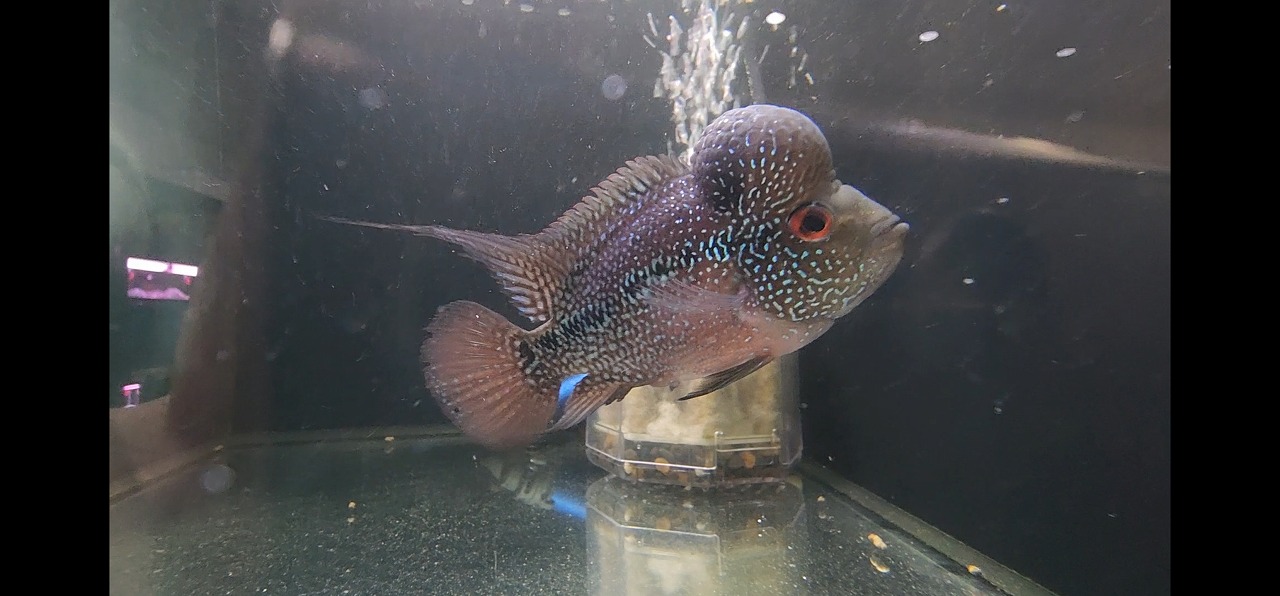 元祖気の強い魚といえばフラワーホーン!イシダイを思い出すような鋭い歯と強い顎、リーゼントのように自己主張する頭のコブ、 混泳厳禁、単独飼育推奨の暴れん坊。 ですが丸っこい体形とベタ慣れする物おじしない性格から愛嬌もたっぷりあります。