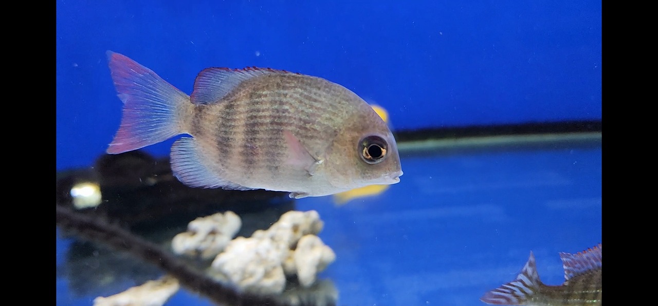 バルーン体形とはうってかわってシクリッド随一の細長体形「パイクシクリッド」の仲間です。ゼブリナの名前の通り、縦縞模様(魚でいう横縞模様)が美しい。ゼブリナは大人しめの性格なため混泳させやすいのも特徴です。人工餌OK!