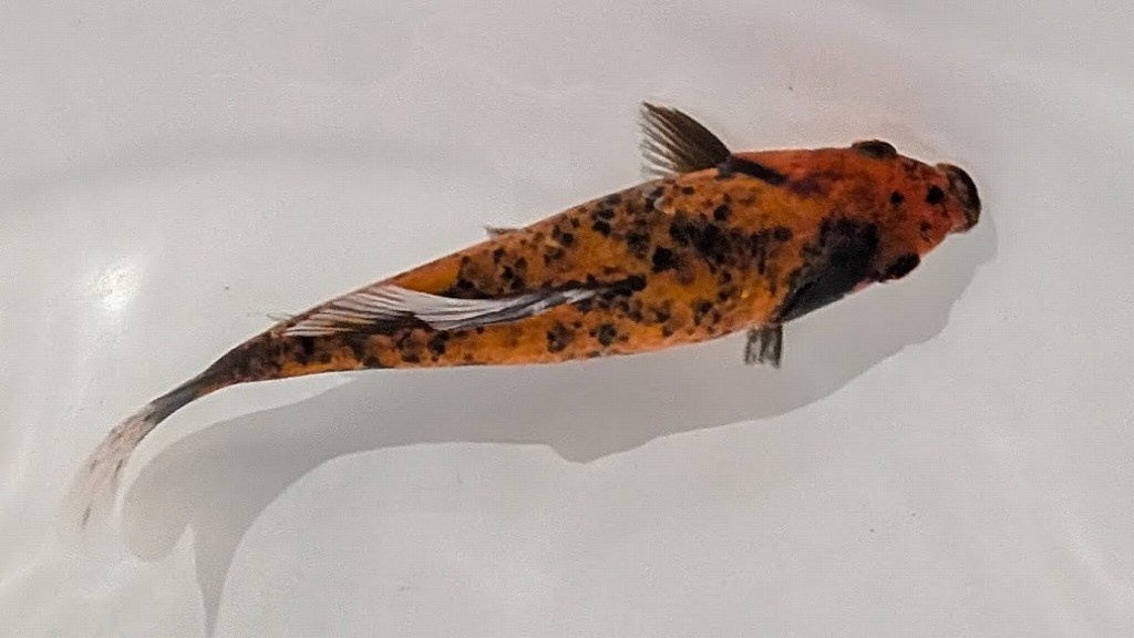 緋の発色と際の良さ、鰭墨、墨鹿の子柄を纏う美しい優美魚。特に両体側の白地に満遍なく入る墨鹿の子柄は美しく見蕩れてしまいます。まだまだ成長過程の愉しみな当歳魚。実魚をご覧になっていただけたら幸いです。