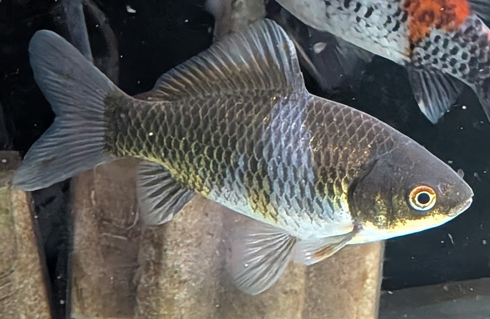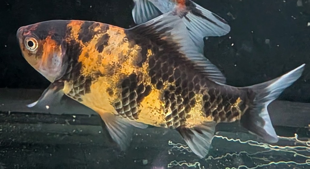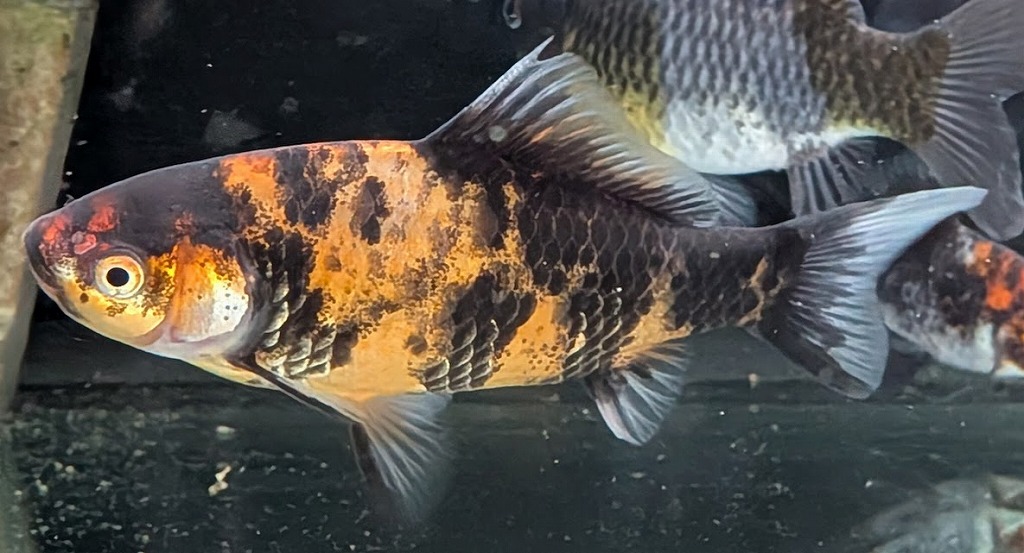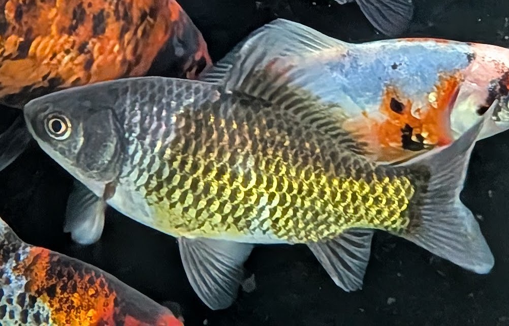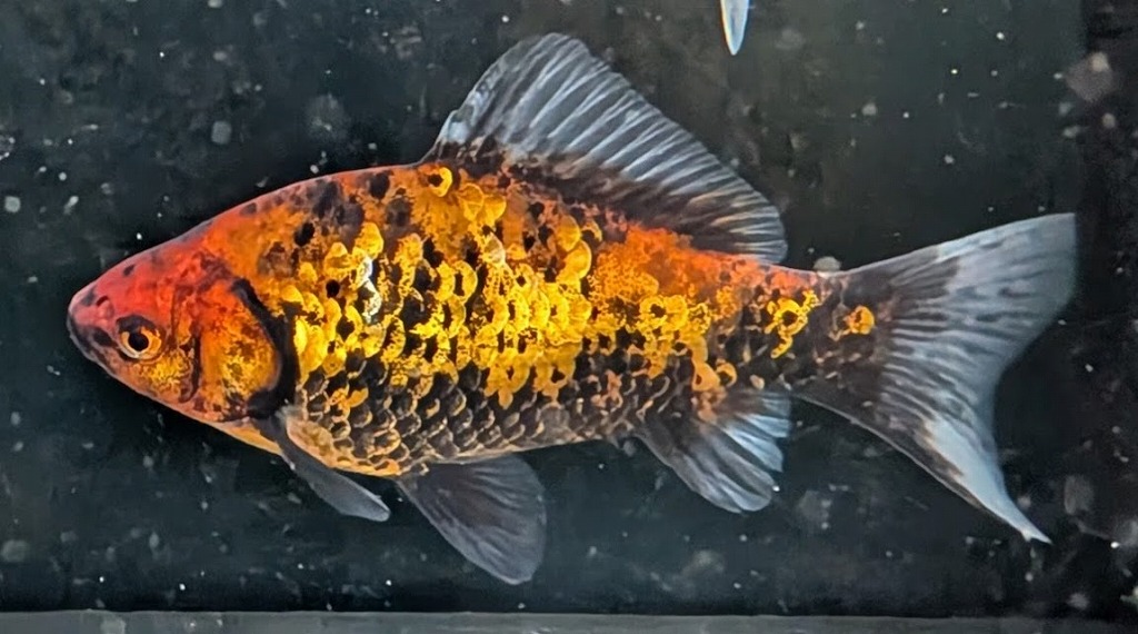 墨色部に銀鱗が重なる事で、鱗縁が黄金色に縁どられているように見える変わり虎柄模様。 くねるように泳ぐ際に魅せる鱗はまるで黄金鱗。墨部は濃いのに対し体色は淡いのでコントラストの美しい個体です。