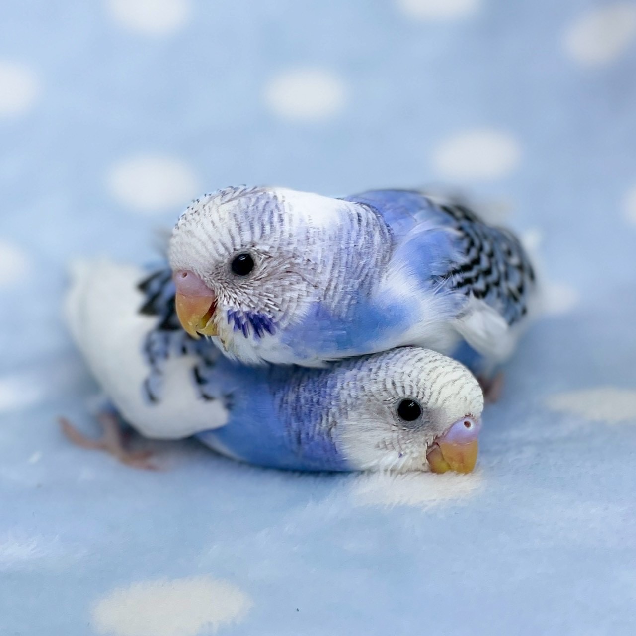 今回きた子たちはさわやか系カラーのブルーパイド🩵🤍2羽で仲良しなのはもちろん、どちらも人懐っこくばっちり手乗りなのでまとめてお迎えしちゃうのもアリかと✨✨