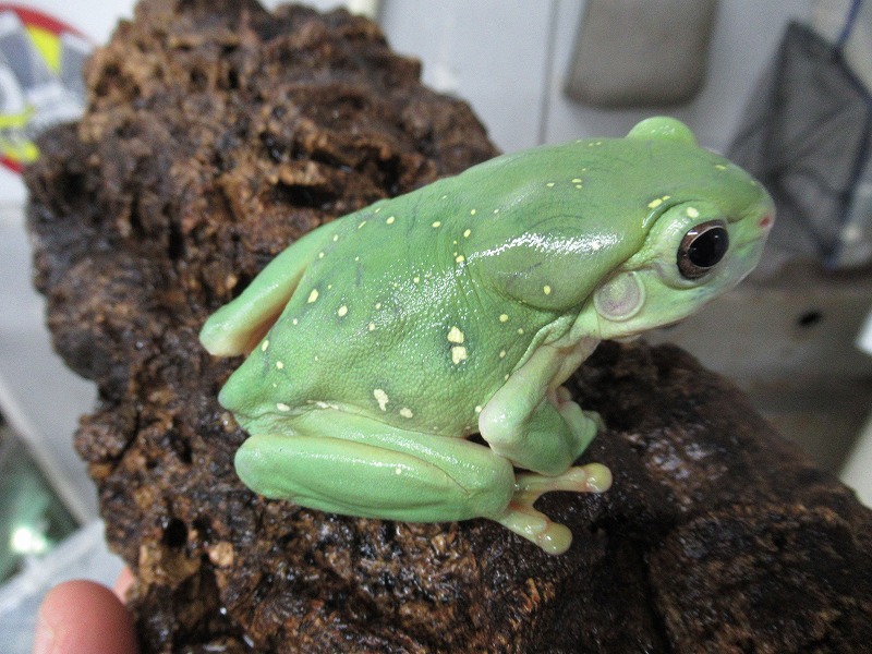 大物現る!オーストラリア原産の憧れの巨大リトリア久々に降臨!!成熟した成体の頭部はまるで腫れ上がったかのように大きく膨れ凄まじい容姿に。体全体に大柄なホワイトスポットが散る豪華な仕上がり。イエアメを豪華に強化した感じの高嶺の花的存在。まさにツリーフロッグ最高峰ともいえる存在ですね。今回は入荷時に雌雄のラベルが付いていたので一応ペア価格も設定しております。