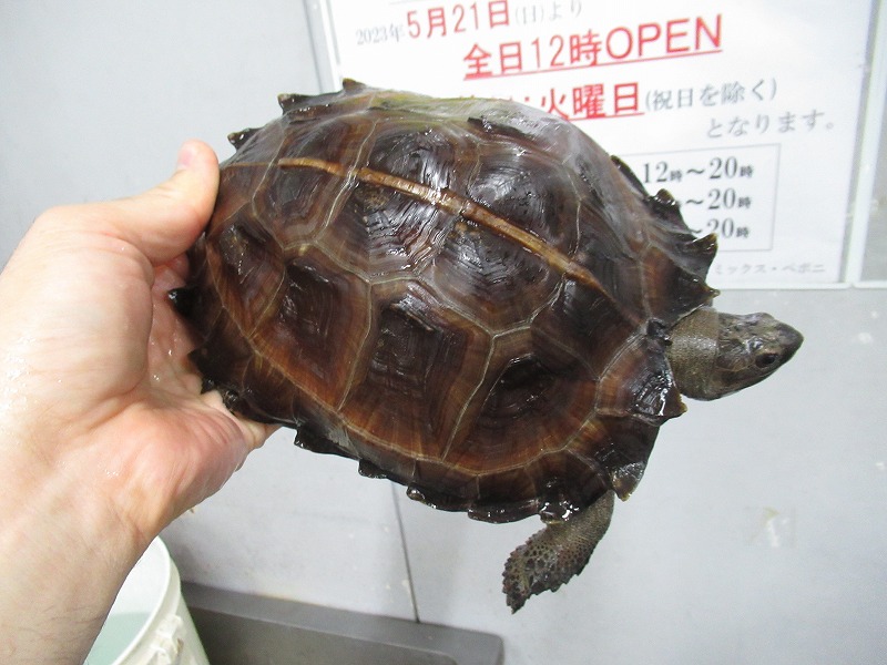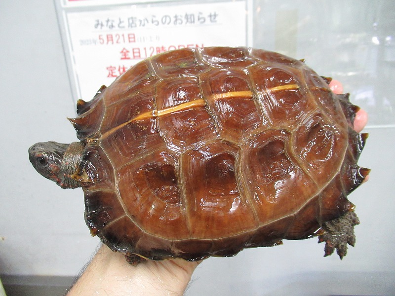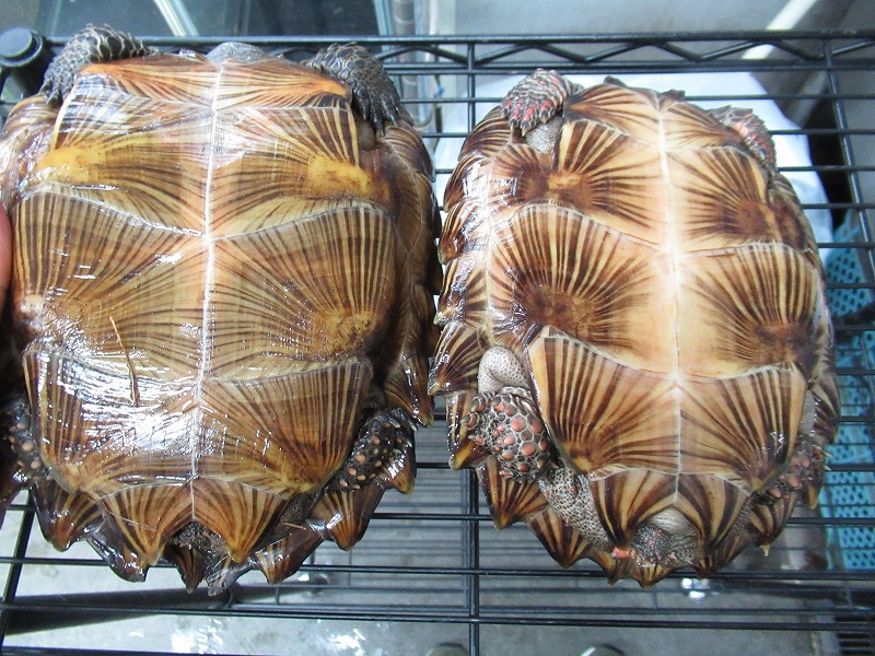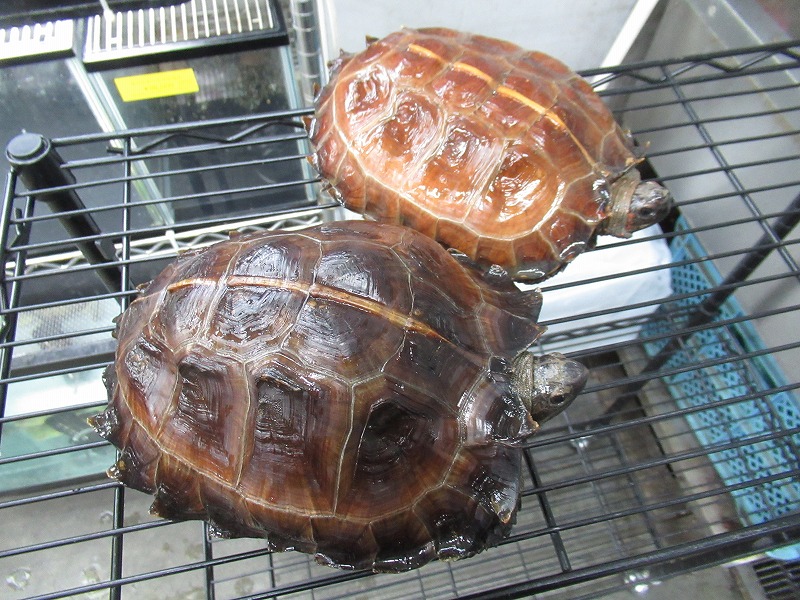 いつもの手裏剣サイズからの国内飼い込み個体。どちらの個体も数年飼い込まれていたのでずっしり重くてパワフル。サイズはほぼ同じですが、それぞれ別口で入荷したので飼い方の違いか、個体差なのか甲羅の色味だけでなく体高も結構違います。