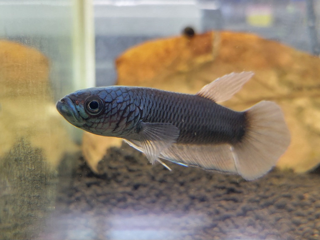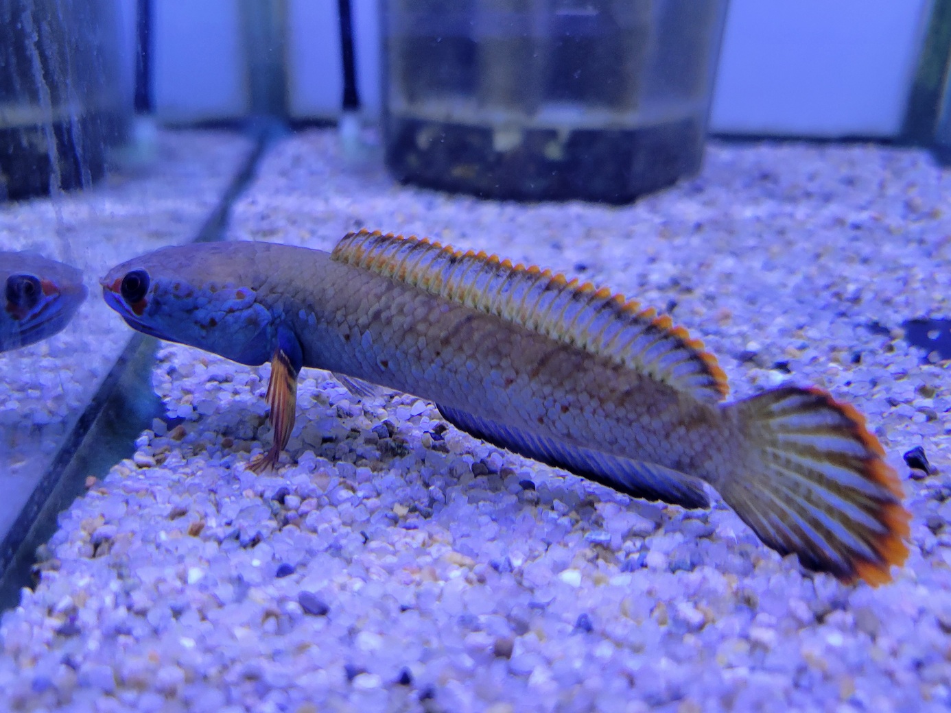 仕上がった成体は体側のブルーと目の回りに見える赤い縁取り、尾ビレに見えるオレンジの縁取りがかなり美しいです!!